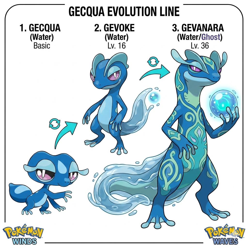 What a charming design! Gecqua looks like the perfect blend of cool and calculated—exactly what you’d want in a Water-type starter. That smug, "putting on airs" expression gives it so much personality, and the tail-catapult mechanic is a clever twist on traditional water moves.Since the region is inspired by Indonesia, there is a wealth of biological and cultural inspiration to draw from for its journey to a final evolution.The Concept: From Shrewd Lizard to Master of the MangrovesGiven its intelligence and the "springy water" mechanic, Gecqua seems destined to become a tactical specialist. Here is a vision for its evolutionary path:1. Mid-Evolution: Gequile (The "Juvenile" Stage)Appearance: Becomes sleeker and taller, perhaps standing on its hind legs more often. Its tail grows longer and flatter, resembling a Gili (small island) or a traditional Indonesian Kris dagger.Behavior: Its "airs" have turned into full-blown arrogance. It wears a "cape" of pressurized water over its shoulders.New Mechanic: It can now create "water traps" on the ground that bounce enemies back.2. Final Evolution: Gequanara (The Shadow Sovereign)Type: Water / Ghost or Water / PsychicInspiration: Based on the Komodo Dragon and the Wayang Kulit (traditional shadow puppetry).The Design: A massive, regal monitor lizard with markings that glow like bioluminescent algae. Its tail is now a powerful, flexible whip that can launch massive spheres of water with the force of a cannon.Signature Move: "Tidal Mirage"The user creates a puppet-like double of itself made of mist. The double takes the next hit, while the real Gequanara retaliates with a high-speed water projectile.Stats & StrategyIf Gecqua were a competitive Pokémon, its "shrewd" nature suggests a Special Attacker with high Speed and Accuracy.