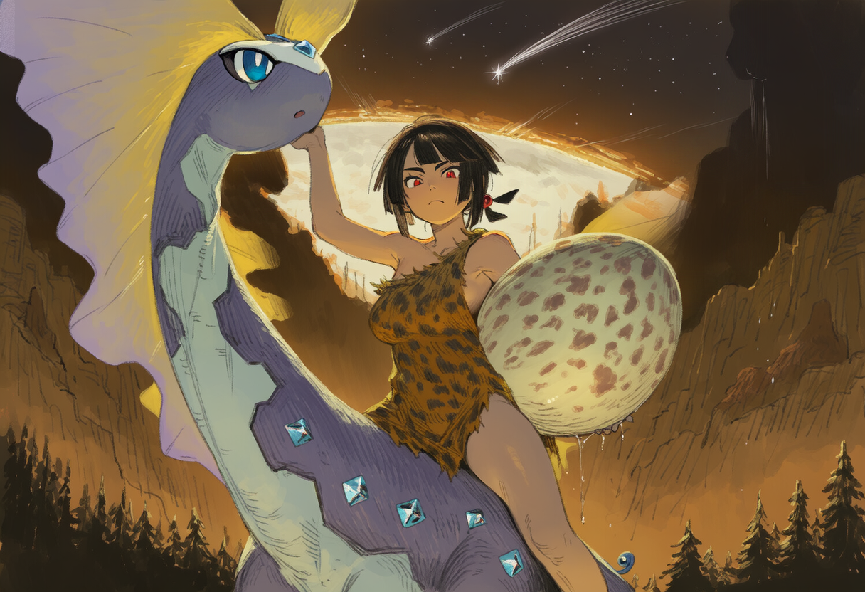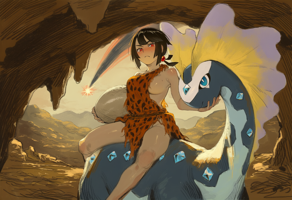 >>59006750Cavewoman Zinnia carrying an egg while riding an Aurorus