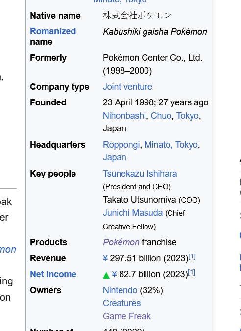 >>59003882It's always funny seeing favelarats assume because a corporation owns their third world shithole wholesale, corporations own all she holds near and dear to her heart too. Sadly, in the real world subsidiary companies are in fact subservient to their ownership interests, which is why Game Freak didn't make a DP remake in Gen 8 like Ishi had expected and why TPC didn't foist, demand or enforce Sheeran on Game Freak, despite /vp/tards SEETHING Pokémon collaborated with a kiddy-popular pip star instead of their favourite death metal drug addict wasteoid. Never mind Teraleak confirmed why anyone with a modicum of intelligence knew, that Game Freak own sole devrights to the core series.