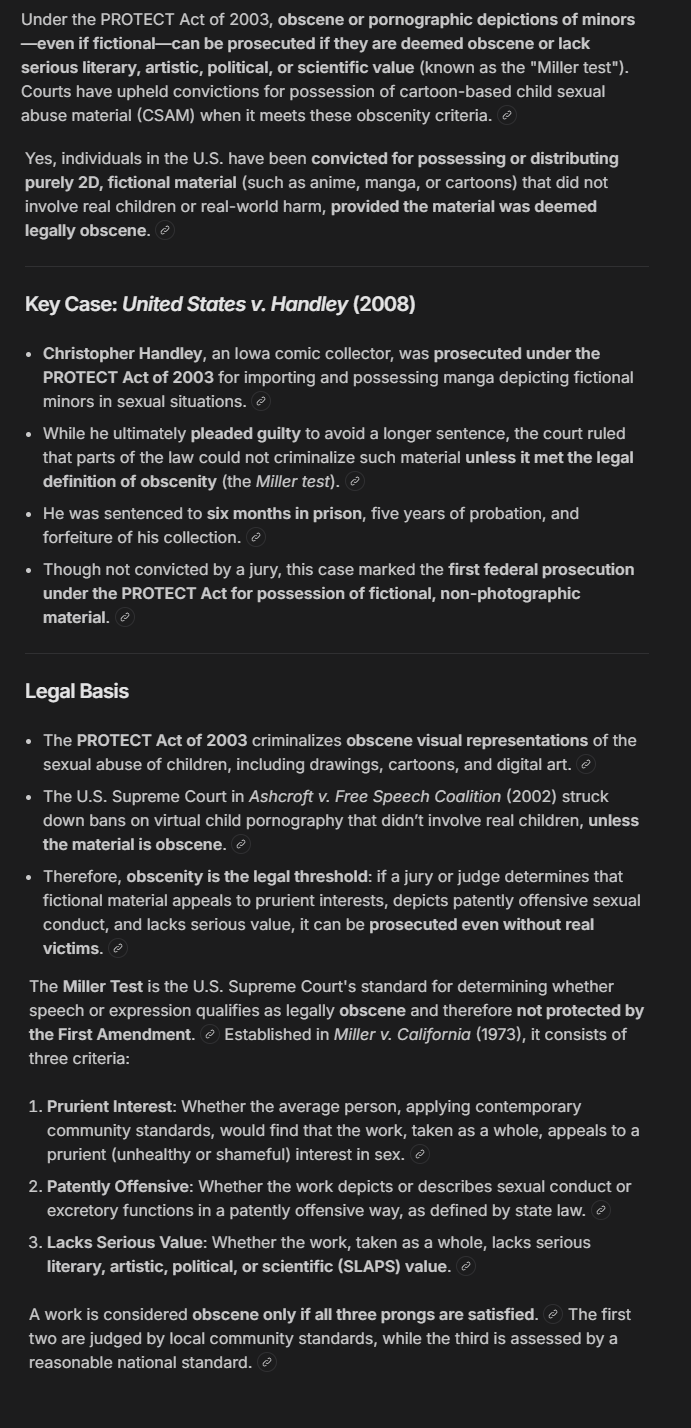 >>59003137>at bare minimum that is illegal. if it can't be distinguished from real CP it's CP as far as the FBI is concerned, doesn't matter if a computer made it.In that regard, it's *all* illegal - drawn or no. Doesn't need to have anything to do with AI, doesn't need anything to do with harming actual kids.You can get charged for this stuff as if you were a kid diddler in the US even if it's purely drawn from the imagination of the artist.>you can post loli to /b/ all day, but truly photorealistic gets you the party vanYou can get away with it, but if they happened to catch you with it on your hard drive and wanted to charge you, they could and would.Look it up.