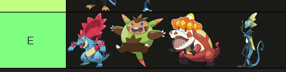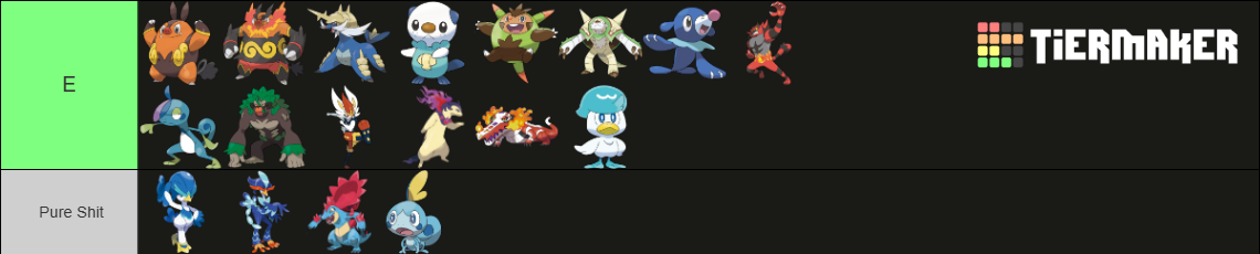 >>59003856I know hating oshawott is a meme here, but I never got it when tepig is in the same gen. It's boring as fuck and its evo line only gets wirse from there.>>59004246Seconded. They're just bloby smears of color with no texture or distinctivness in their desings.I will say, Browt has grown on me for how stupid it looks, but that won't prevent me from saying it has a bad design>>59003938This guy still has such a wierd evolution line to me. Why'd they immediately drop the clown shtick for a ballerina theme instead? Why'd they make him troon out?>>59004470If mudkip is a three course meal, soble's a TV-Diner. I do like him, though>>59004581Litten was my favorite Alola starter and I still agree with this. Hated seeing my cool cat bro roid out for the first time