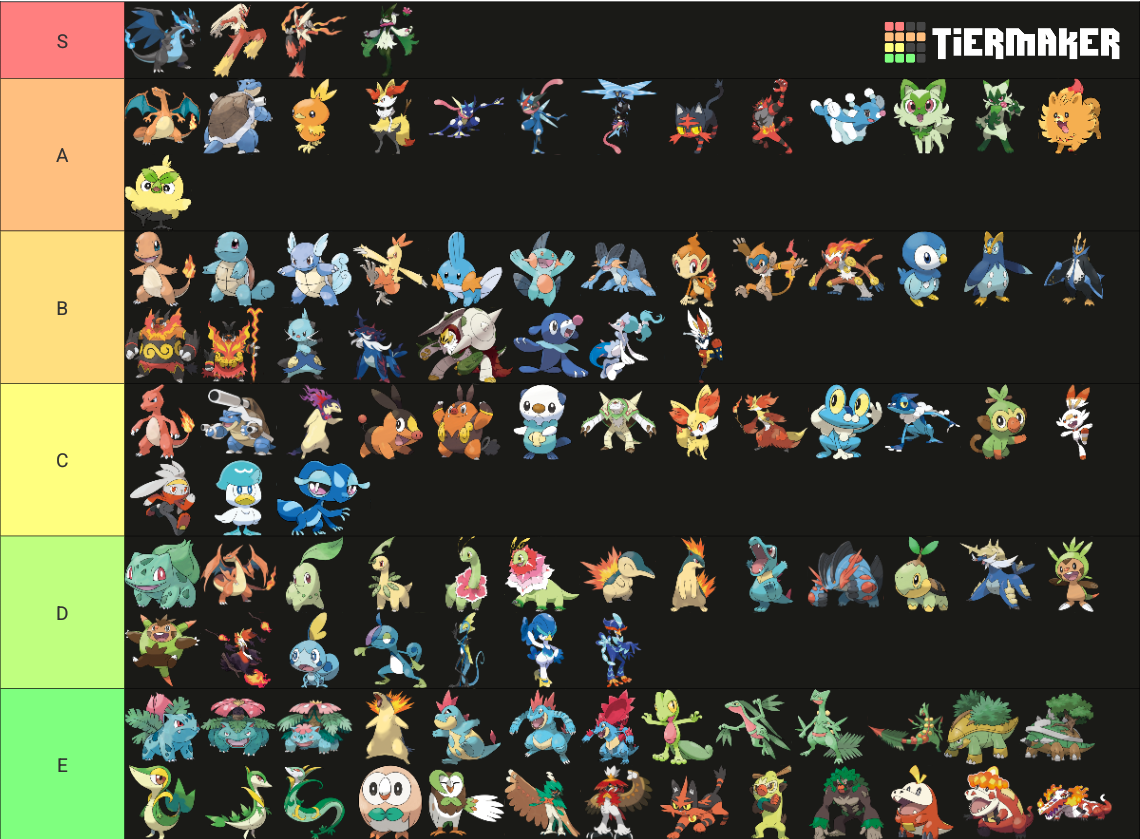 >>59003856>Gen 1Blastoise >Gen 2None surprisingly >Gen 3Same as above >Gen 4same as above >Gen 5Tepig line. I also don't like Samurott colors >Gen 6Quilladin. I hate the design. I also don't like Mega Greninja.>Gen 7Incineroar.>Gen 8Not the biggest fan of Rillaboom.>Gen 9Fuecoco line