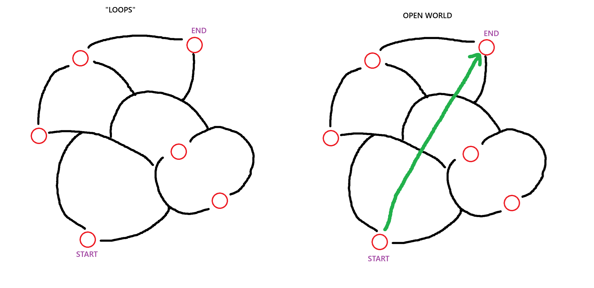 Take two worlds presented in this image, red circles are points of interest, you are at one location and need to go to another, the loop based structure, you have multiple different paths to take there, and you could take a different path on the way back, there may be stopovers along the way, or you may remember something else you need to change to a different path halfway through. It creates a strong sense of adventure.