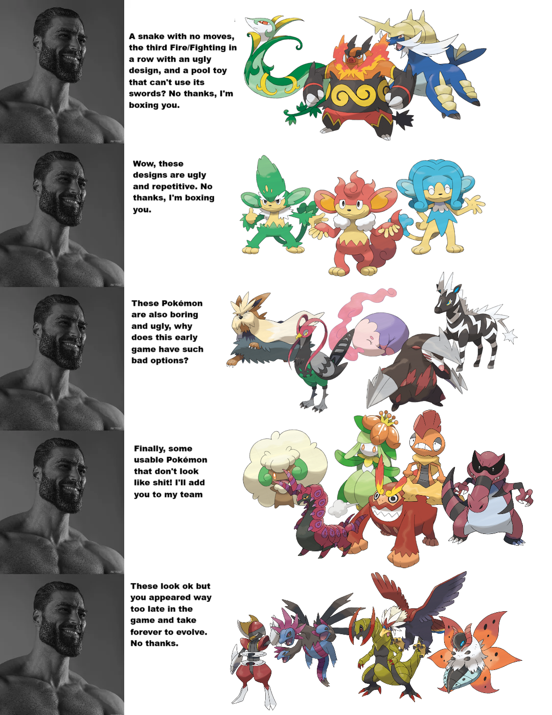 >>59005620>startersHonestly, the only one I don't like is Emboar. The other two are fine.>monkeysabsolute abominations, I agree>boring and uglyStoutland, Excadrill, and Zebstrika are cool. I don't hate Unfeazant, it's just really bland.>usable PokemonMost of them are cool>final batchI agree, they evolve way too late