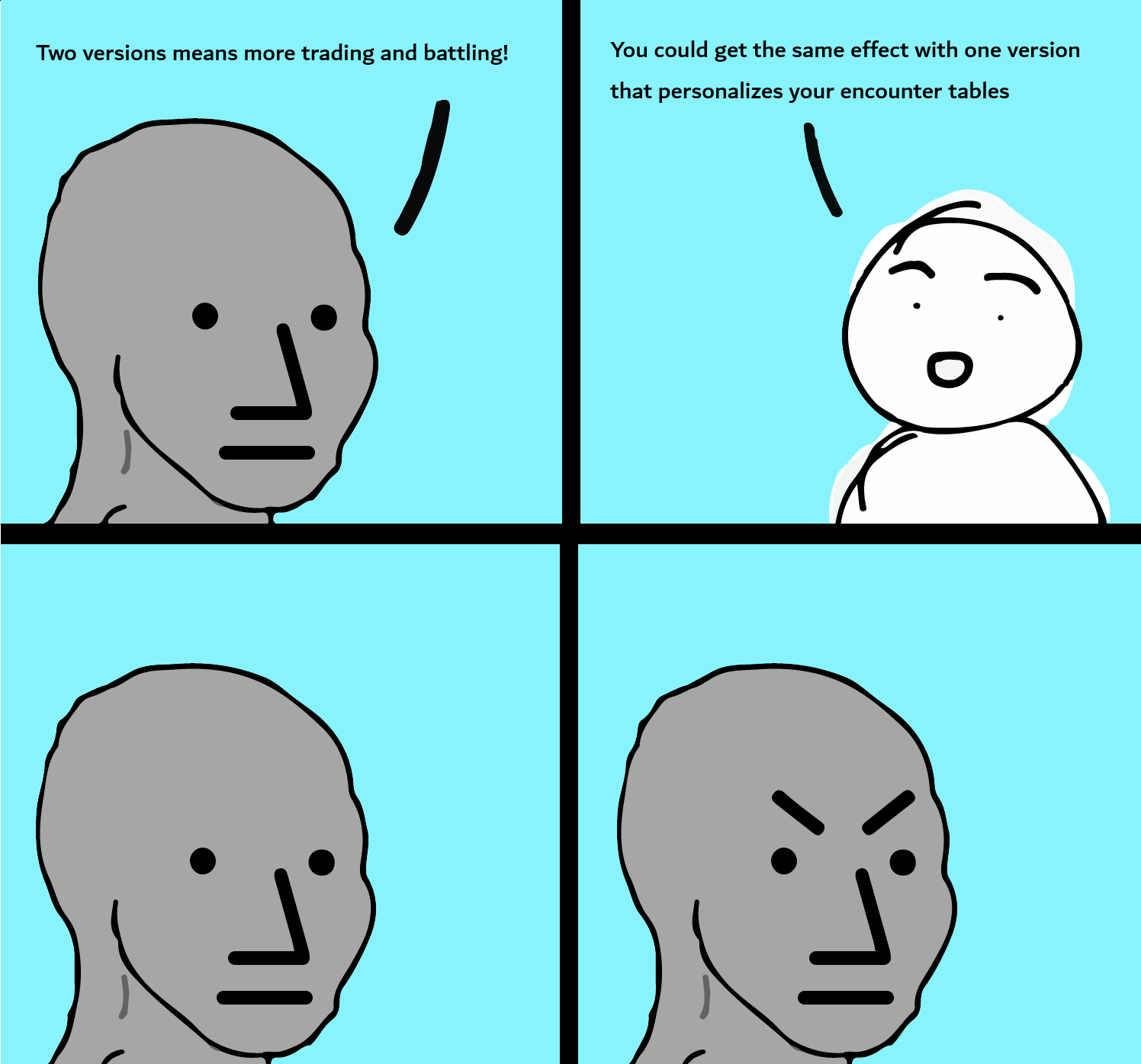 >>59022117You don’t have to completely randomize all encounter tables, anon. At the least impactful end, you could take all of the “version exclusive” mons and for each one, roll to see which one your save would get. That could be extended further to slightly randomize encounter tables beyond just those mons (with over 1000 to choose from it’s not like they’re hurting for available designs) so you wouldn’t have Romhack everymonosis with clusterfuck routes that have 18 unique encounters per patch of grass, but you don’t have to permit>huehue garchomp in the route 1 grass, oddish in victory roadAmong the most iconic “you have to trade to get them” mons are starters and every version has all of them, the only limit is you can only pick one per save file. It’s not like you don’t encourage trading by per-save restrictions. Multiple game versions is literally just>we know you’ll buy it twice