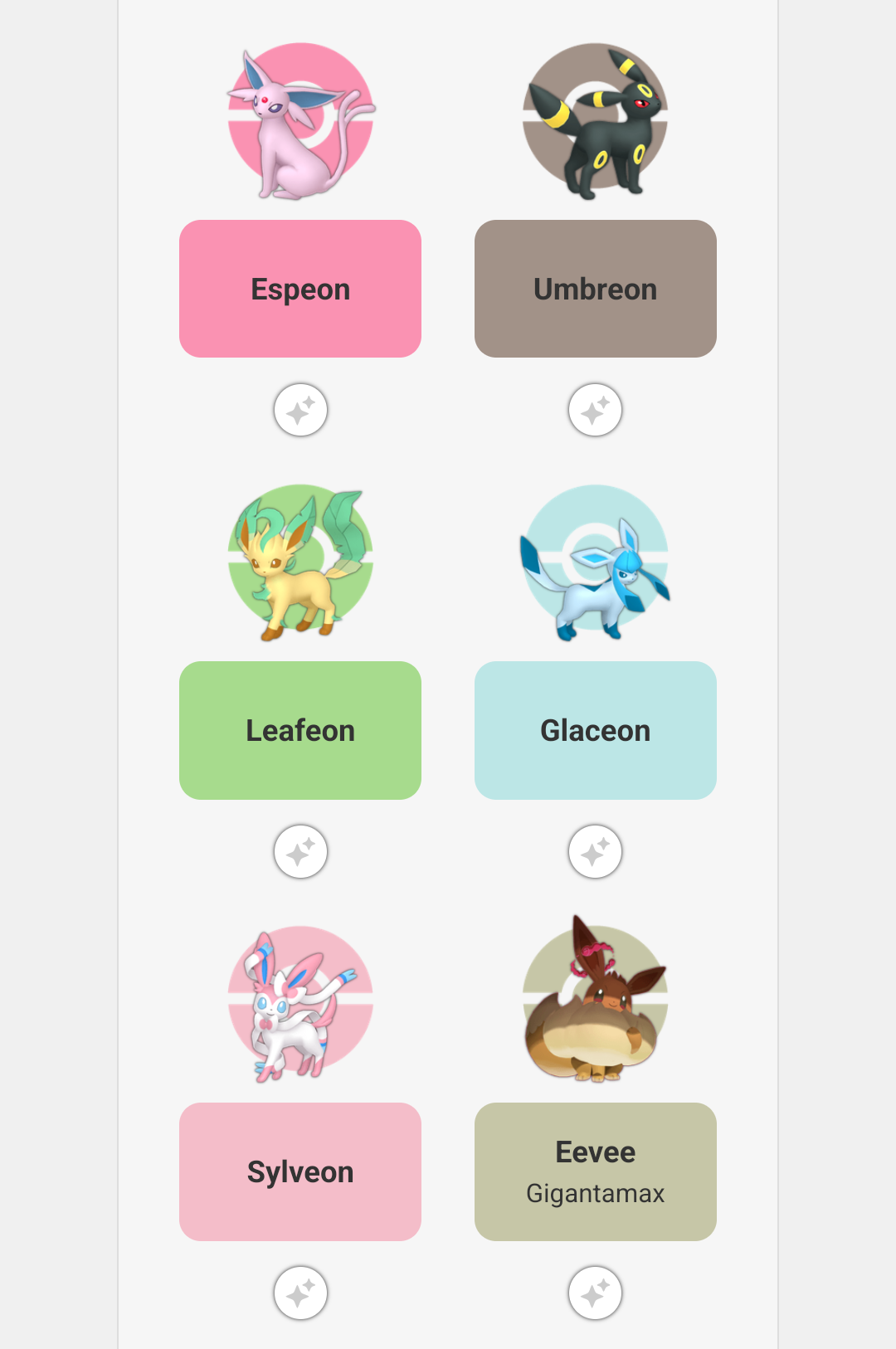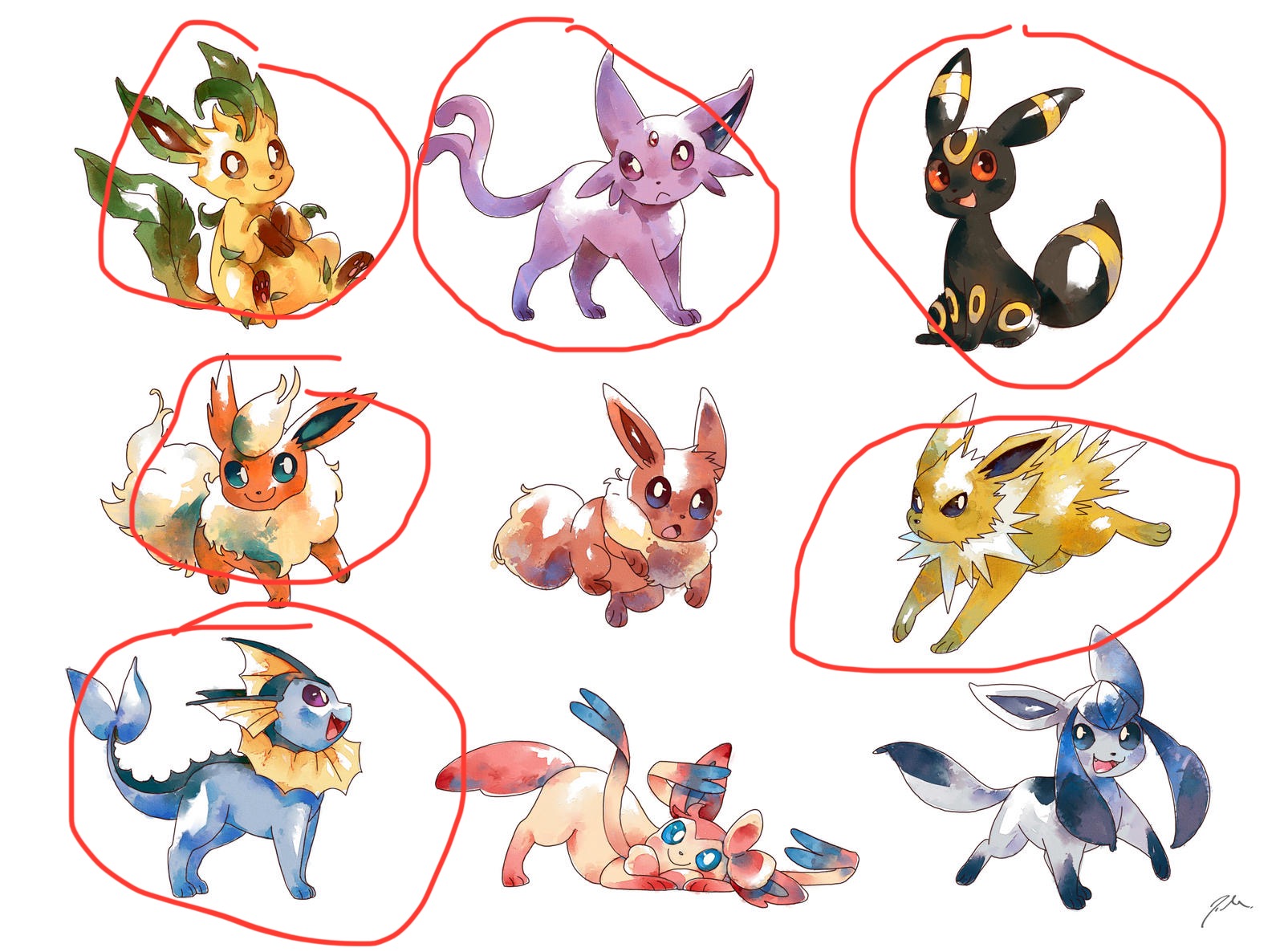 Umbreon, Espeon, Eevee, Jolteon, Vaporeon, Glaceon.
