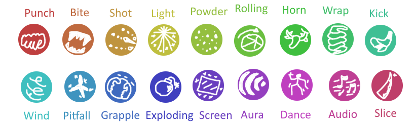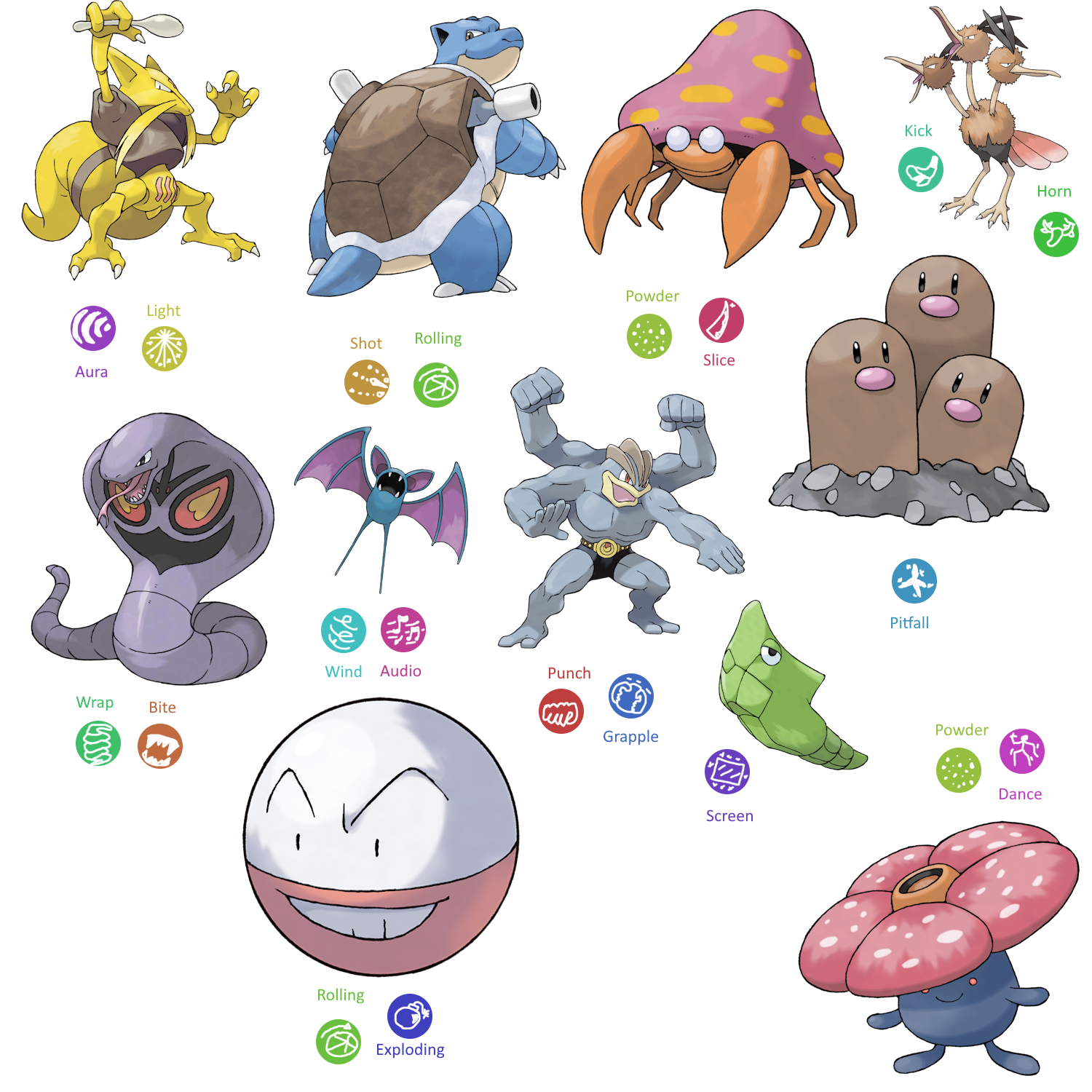Bulbasaur: Wrap / PowderIvysaur: Wrap / PowderVenusaur: Powder / LightCharmander: Bite / ExplodingCharmeleon: Slice / ExplodingCharizard: Wind / ExplodingSquirtle: Shot / RollingWartortle: Shot / RollingBlastoise: Shot / RollingCaterpie: Wrap / ShotMetapod: ScreenButterfree: Powder / WindWeedle: Horn / ShotKakuna: Horn / ScreenBeedrill: Horn / WindPidgey: WindPidgeotto: Wind / SlicePidgeot: Wind / SliceRattata: BiteRaticate: Bite / SliceSpearow: Wind / HornFearow: Wind / HornEkans: Wrap / BiteArbok: Wrap / BitePikachu: Light / ShotRaichu: Light / ShotSandshrew: Rolling / PitfallSandslash: Slice / PitfallNidoran: Horn / ShotNidorina: Horn / ShotNidoqueen: Horn / PitfallNidoran: Horn / ShotNidorino: Horn / ShotNidoking: Horn / PitfallClefairy: Aura / LightClefable: Aura / LightVulpix: Bite / ExplodingNinetales: Aura / ExplodingJigglypuff: Audio / AuraWigglytuff: Audio / AuraZubat: Wind / AudioGolbat: Bite / WindOddish: Powder / PitfallGloom: Powder / PitfallVileplume: Powder / DanceParas: Powder / SliceParasect: Powder / SliceVenonat: Powder / AuraVenomoth: Powder / WindDiglett: PitfallDugtrio: PitfallMeowth: Slice / ShotPersian: Bite / SlicePsyduck: Aura / ShotGolduck: Aura / ShotMankey: Punch / KickPrimeape: Punch / KickGrowlithe: Bite / ExplodingArcanine: Bite / Exploding
