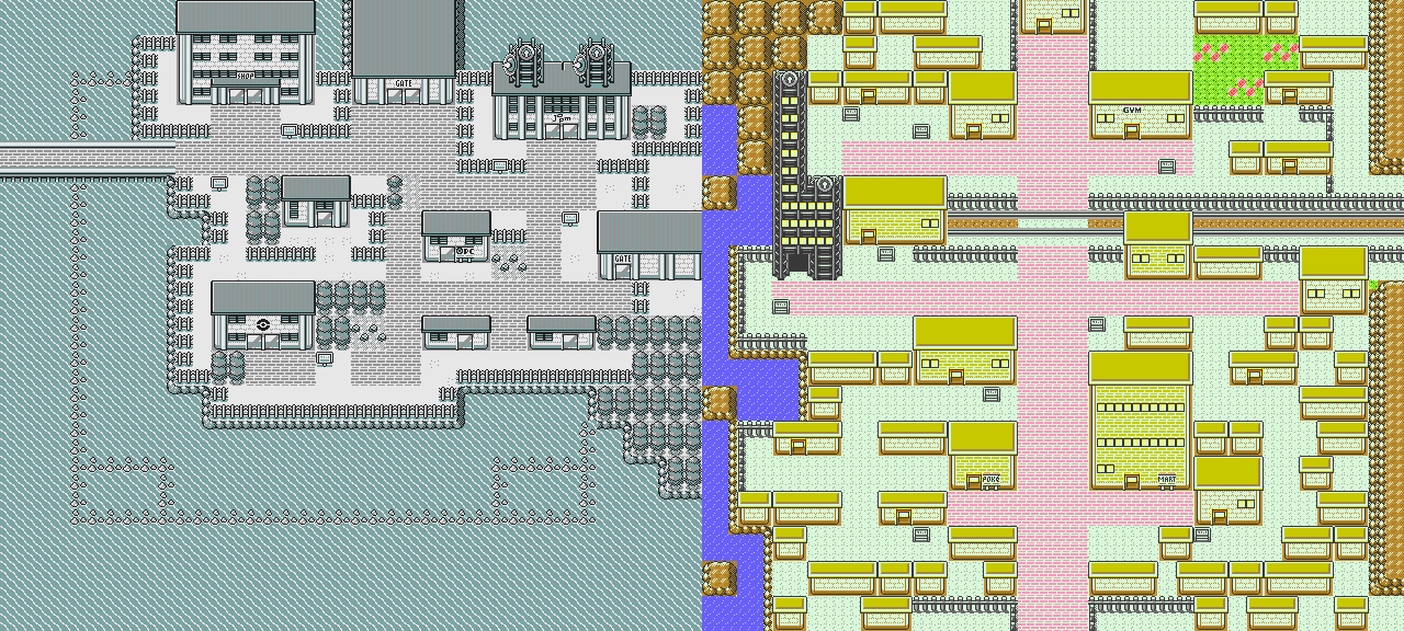 Generally I just don't think Masuda's a good game designer, all of this games feel incomplete because he's planning the next game while working on the current ones usually and compromises heavily on the vision to satisfy daddy Nintendo. One thing people don't really bring up about the ambitious 97GS release is they clearly had more ambitious concepts for the game's presentation that was dropped in favor of making the game mostly look like generic houses. Goldenrod is a bigger map but it uses less of its space effectively and introduces these annoying grooves (likely "realistic" to Osaka, but not fun in a gameplay sense) while also having EXTREMELY generic building tiles that make it hard to determine what is what without the lazy Gym and Mart labels. The only real improvement Goldenrod makes on the West concept is adding the iconic Magnet Train, which was 100% only added because Osaka needs its train to be Osaka. HGSS fixes a lot of the presentation issues of Goldenrod, among other cities