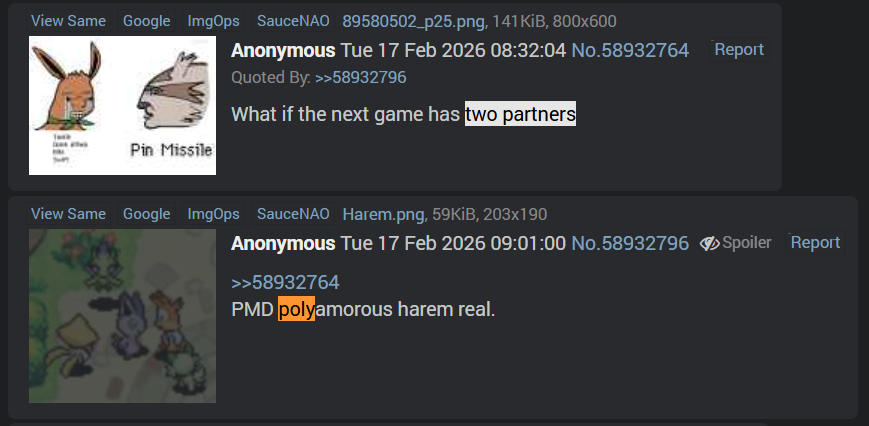 >>59033851A bit odd to leave out the link to the Q&A. Was that intentional?>Do you believe that Spike Chunsoft will release another PMD game within the next 3 years?Fat chance. Anyone thinking, "But Pokopia will reignite interest in npin-offs" They'll probably surpass the live-time revenue of Pokopia with just a few months of microtransactions from their wide palett of mobile games. And honestly, I don't find myself buying a Switch 2, even for a new PMD.>What is a "monkey's paw" plot point you'd secretly love to see in a PMD game but know the chances of it being done well are next to none?IDK, something like natural disasters being stoped by plunging the world in stiltness and stagnaation? Not really sure about that. I'll give a quick shout out to the hack: PMD: The Bright Future instead.>If they brought back exclusive items, what would be some good ones for newer Pokémon?No, just fucking no. You expect me to go "Oh, I'd loved it if they added this cool new effect to the game to then lock it behind grinding for a specific item and restricting it only to Dachsbun."?>How do Pokemon celebrate big events? Fireworks? Flashy displays of advanced moves?I think the pokémon are smart enough to know not to pull out a celebratory gunfire. Fireworks for sure.