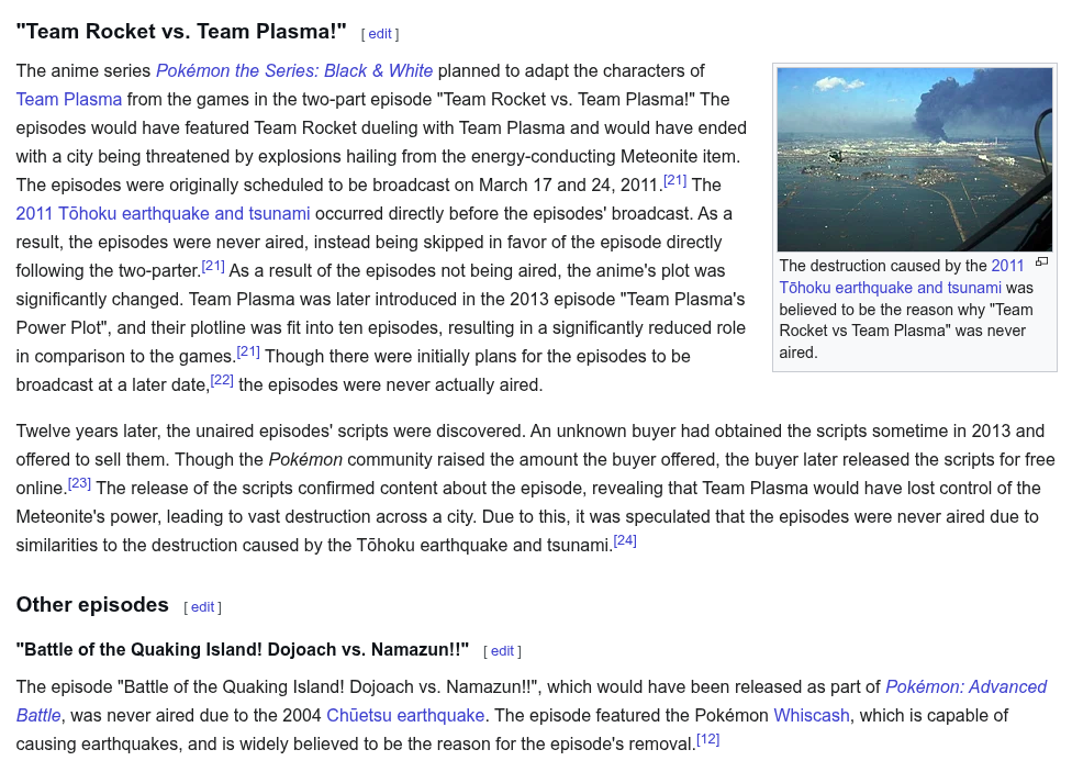 >>59043422I think a big earthquake just happened to happen when the anime aired some episode with lot of earthquake(the attack) action. Ever since then they havent used the move in the show.