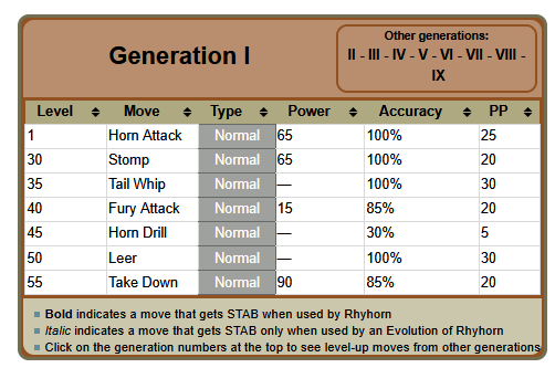 >aren't that badRhyhorn is a Ground/Rock type and pre-evo to Rhydon, one of the first Pokémon EVER designed.Here is his learnset.One might wonder why he learns zero Ground or Rock moves.One might wonder why he learns both Tail Whip AND Leer (they are identical).One might wonder why one of the slowest Pokémon in the game learns Horn Drill (OHKO move), which will auto-fail against a faster opponent.Let us examine the Pokédex entry...>Strong, but not too bright...See, now this is the genius of Generation I.Rhyhorn is canonically retarded and his learnset is actually good in context.These layers are what the illiterate tard generations are missing.