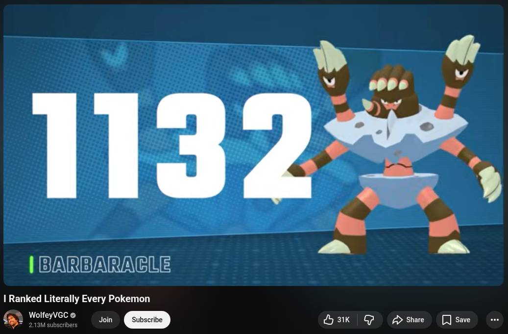 >>59058555half of all Pokemon probably deserve a 3 or lower in terms of how iconic they are. It's placed below Arrokuda ffs a Pokemon that's obviously worse competitively, he says he doesn't like, and has lower Bulbapedia page view amount since I'm not sure what else you'd even determine iconicness score on.