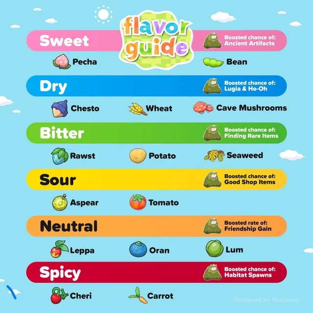 >>59060468you can make do without using houses at all, just make sure they're in a habitat they actually like so in case of squirtle, be near the water, them give them a bed (just make one that you think is pokemon-like, I'd guess the straw bed (this can be shared by multiple pokemon, press R3 in their habitat to see the range of stuff it counts for them) put some toys around and decorations (doesn't have to be a tv and remember to position them so they can be shared by a lot of pokemon) and most importantly of all check the pokedex to see what flavor they like and give them the respective food based on this image, so in case of squirtle, since it likes sweet, give it beans. This usually puts the pokemon in at least a "nice" status, sometimes more