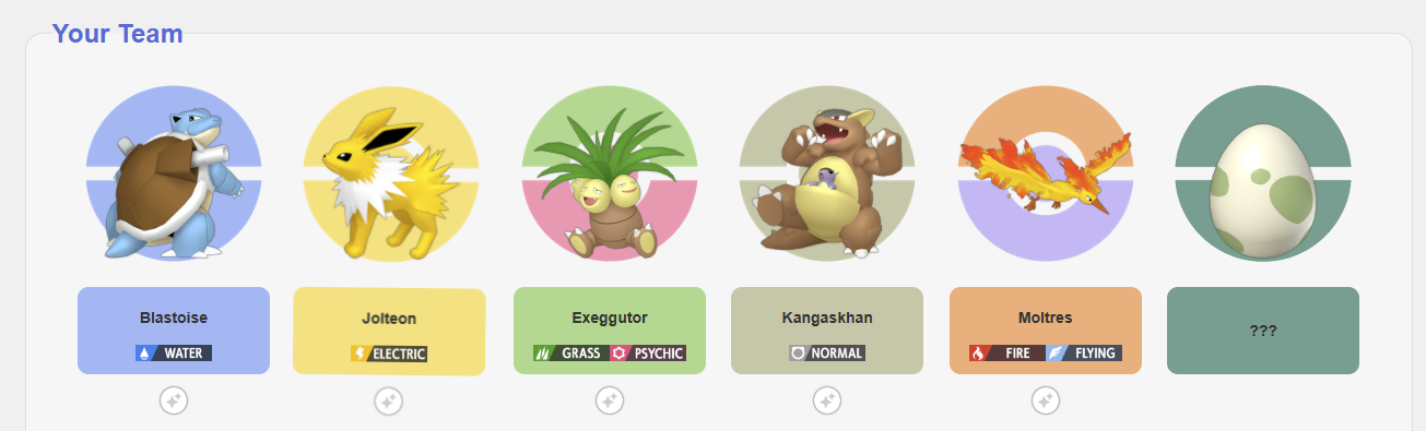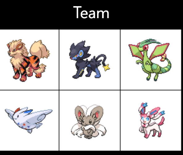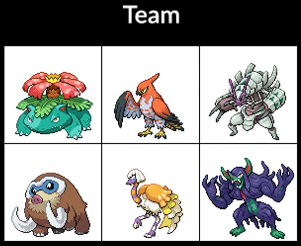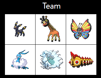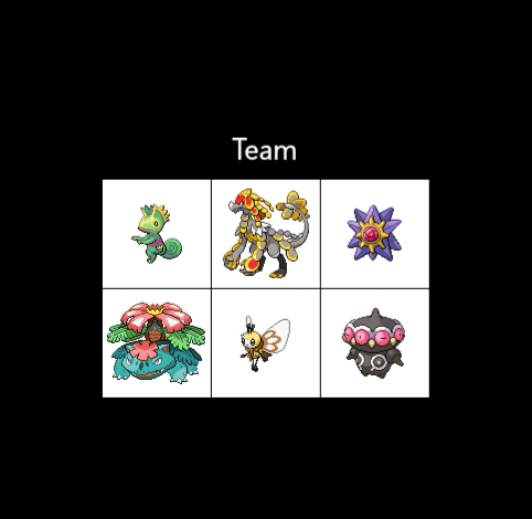 post your ideal team youd have if you were in the pokemon worldthere are various team planner sites, i just used this one from the favourites picker because it was the only one i could find with vivillon patterns: https://cajunavenger.github.io/