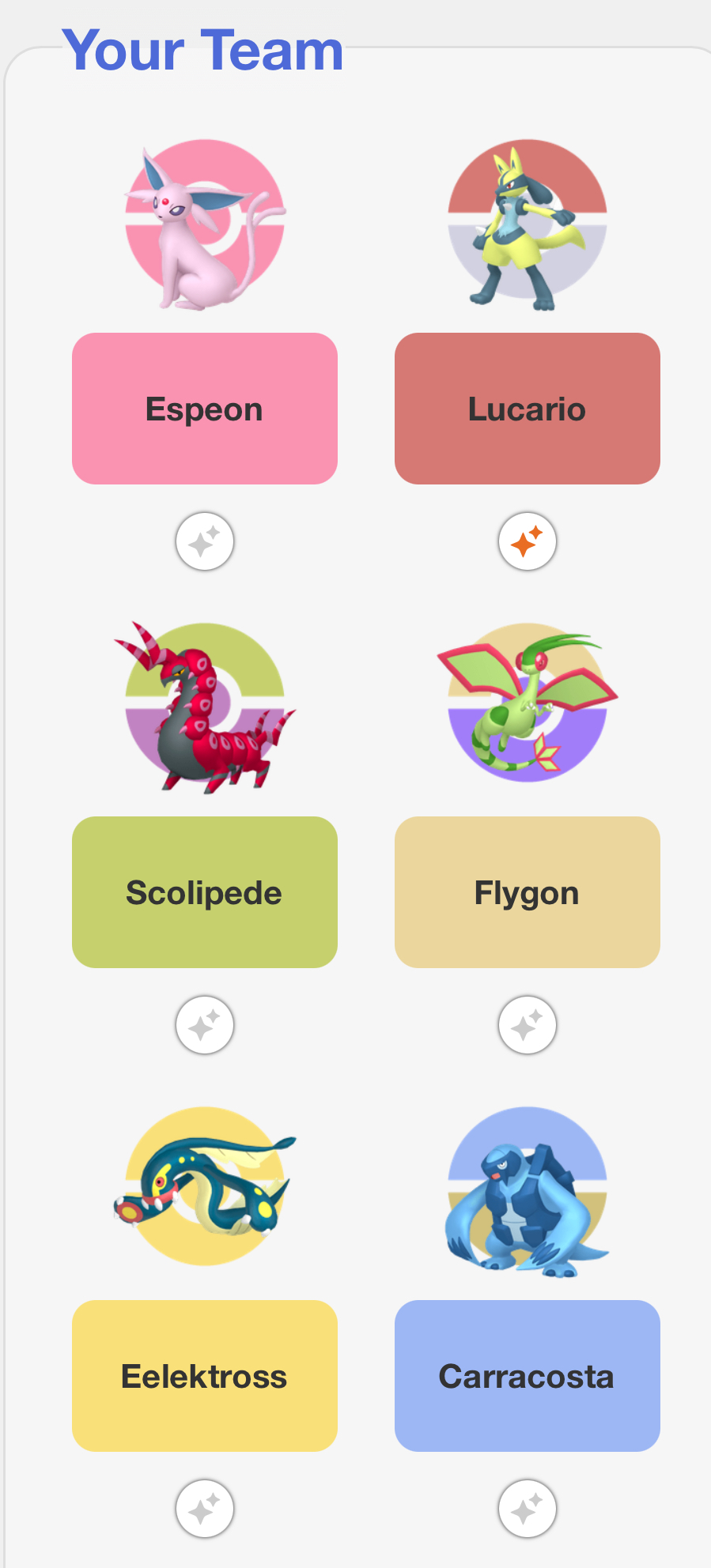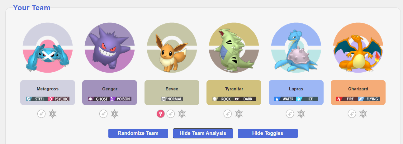 Hard to decide, but i generally consider Metagross to be part of all of my team comps. And I just love unevolved Eevee. Charizard has that ancient connection with me from when I first picked up Pokemon Red. Gengar is the pokemon I always wanted but was never able to somehow get legit outside of Pokemon Red when I actually had friends to trade with. Tyrannitar could easily be switched out with Garchomp, Aggron or Steelix. Lapras could be switched with Gyarados or Hisuian Goodra, Dragonite or Salamance.