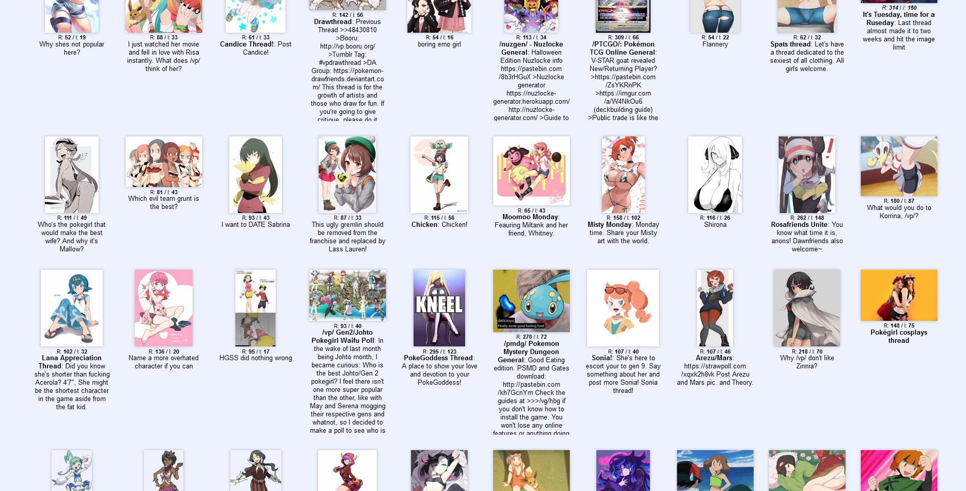 >pokemon board>10% of threads are about fictional little girlsLiterally every other board would insta nuke them and yet all your comments and posts stays up. I think i should avoid going to convention centers to avoid you freaks and then whenever you line up and gamble on TCG statistically one of you coomed to lolis