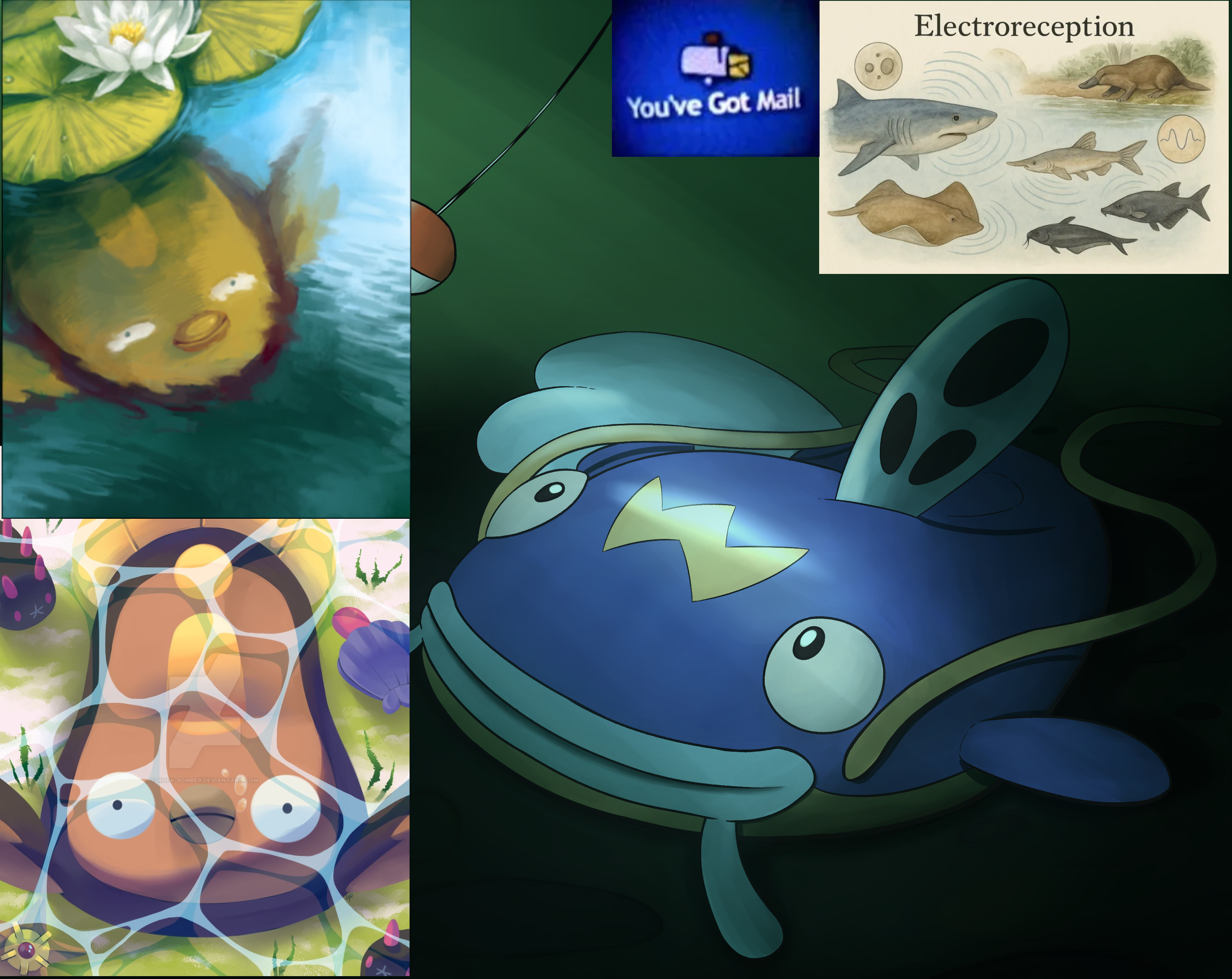 Reposting from last thread: Request for an image of Whiscash and Stunfisk chilling together in the mud/muck at the bottom of a pond or lake. Additional details you might expect at the bottom welcome. If you choose to color, it should be relatively gloomy.