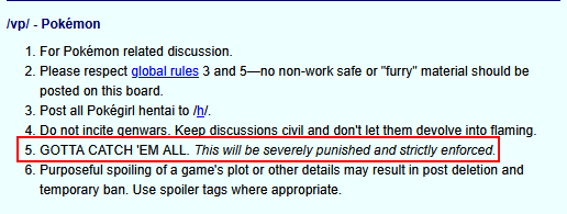I was always under the impression that this rule meant you could not post the phrase "GOTTA CATCH 'EM ALL"