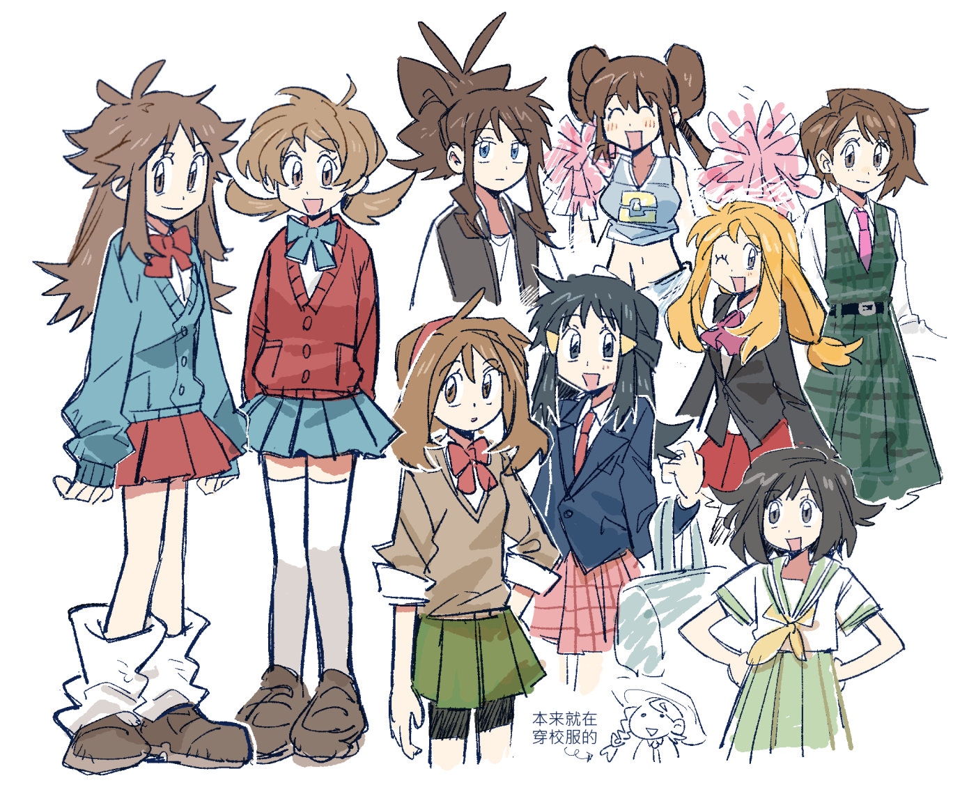 Hilda and Rosa are wearing more "typical" American school clothes, like a letterman jacket and a cheerleader outfitGloria has a typical British school uniform, though I think they'd wear blazers over there Leaf and Lyra have nearly identical uniforms which I guess would make a lot of people here bust their guts But that makes it a bit confusing, since isn't Chicken from Kanto? So she would have the same uniform, yet has the most Japanese one of all