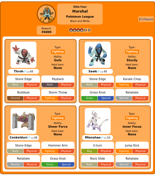 >>59071659>doesn't use scrafty, the one non-starter fighting type he could use in black and white that can't be related back to martial arts even though it has a higher bst than sawk and throh and lacks the psychic weakness the rest of his team has>his base team doesn't change with the expanded dex in b2w2 even though shauntal gets a drifblimWhy not use Shauntal as your example? Her BW team is literally just the four fully evolved ghost types in the dex and it's her fault that elite four teams went down from 5 to 4 for two generations.