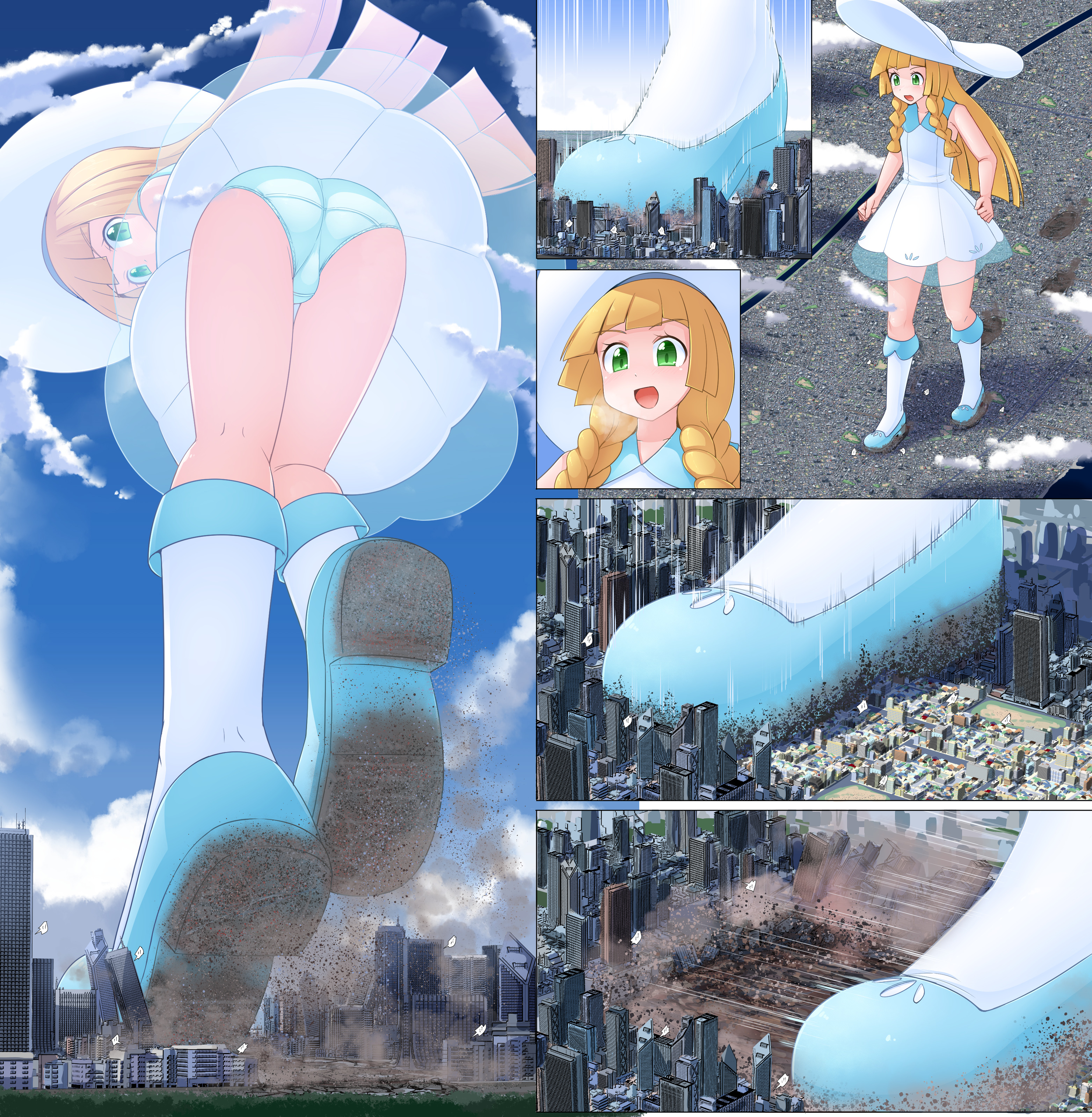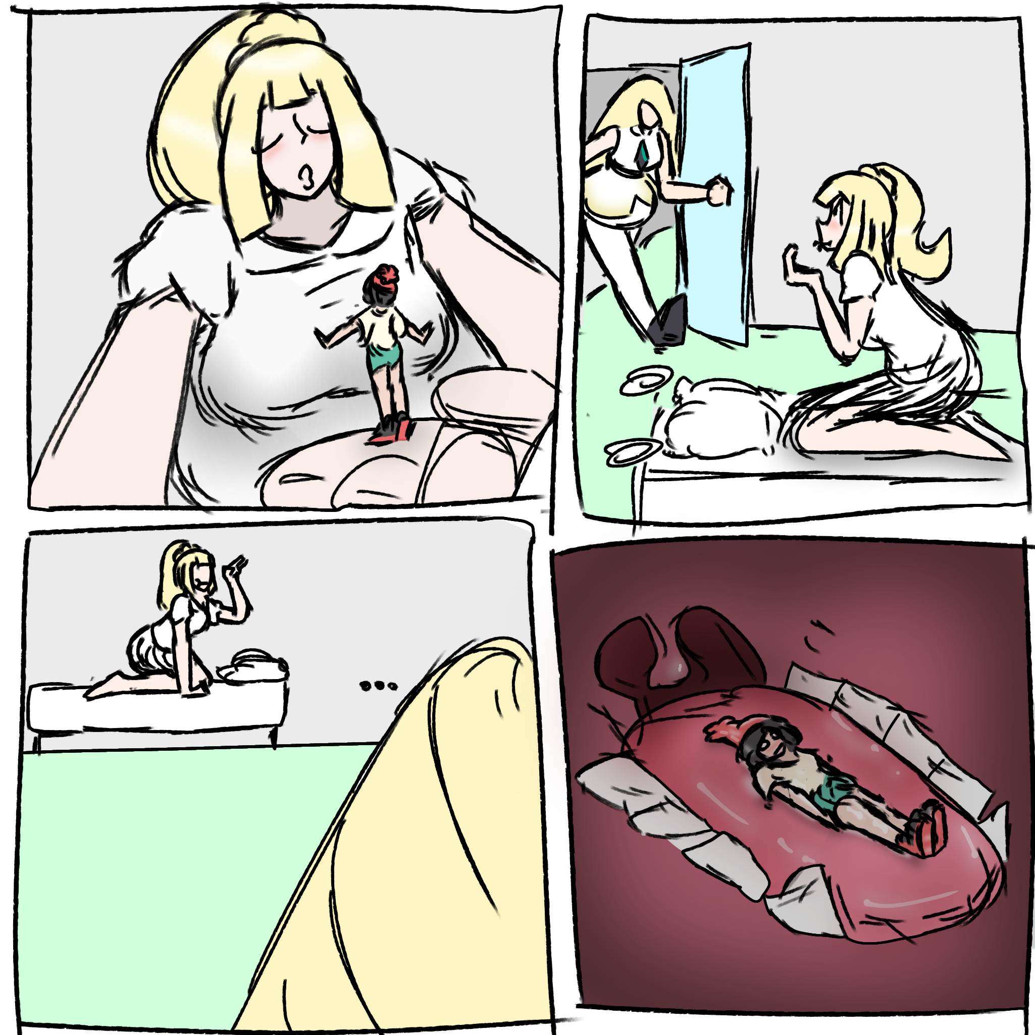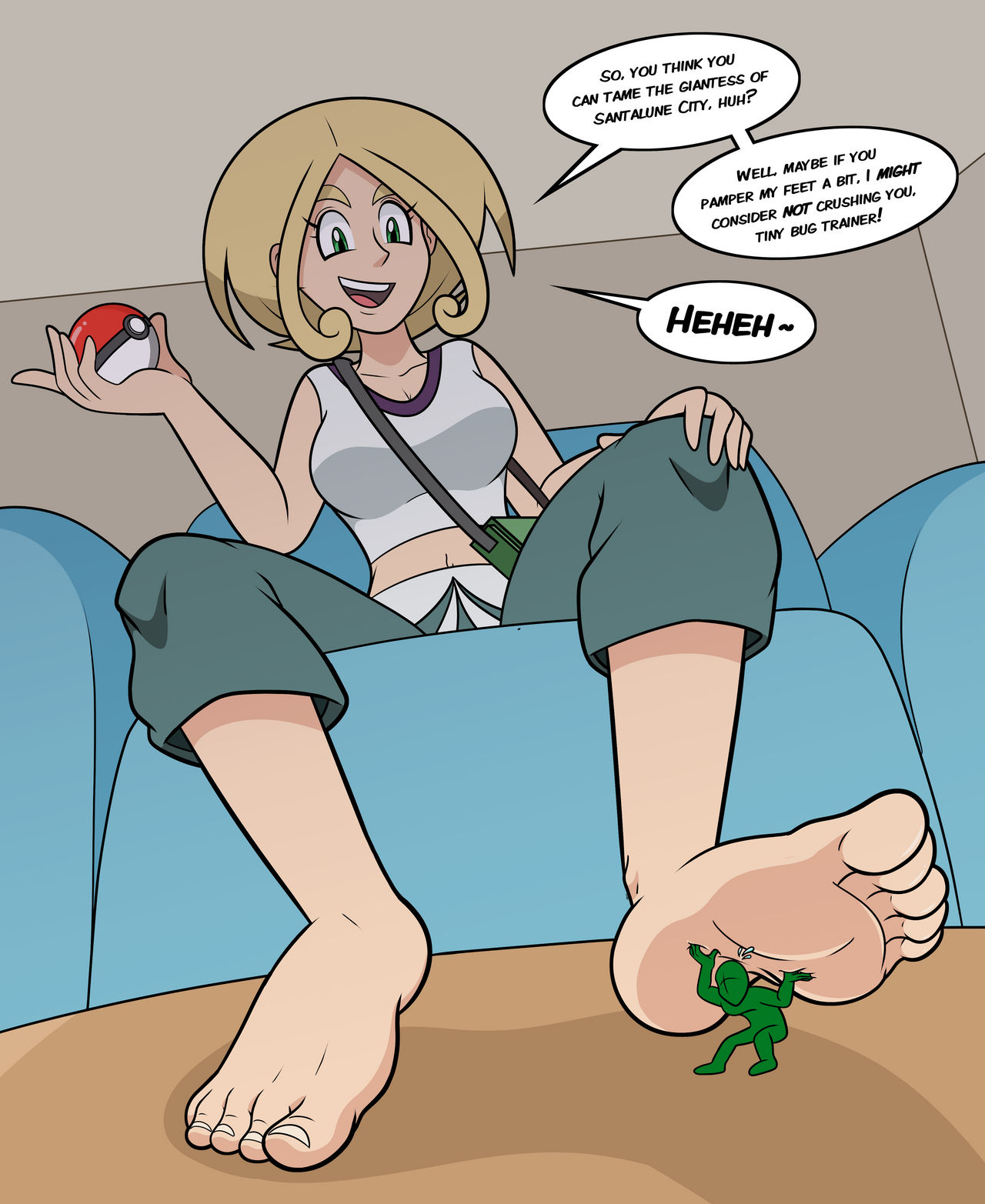 >>59091739>”Ready?” asked Serena>”Ready” replied Calem before being sprayed with a minimize potion> Serena kicked off one of her shoes and lowered her stockinged foot on to the still shrinking body pressing out the rest of his size until he diminished to his usual size of 1cm “you like that little man?” Serena boomed to the speck she stepped on>the pair’s cringy roleplay, they’ve been doing ever since they started dating, was interrupted by the buzzing of Serena’s phone>to her terror it was Calem’s mom calling. A very traditionalist woman who might have been ok with her son being homeless and fighting wild animals for money, but wouldn’t approve of him and her doing together anything spicier than homework>”Serena? I’m near where you live, why don’t you and Calem come over to say hi” >from her tone Serena knew “no” wasn’t an available answer. She lifted her foot and looked at speck seized Calem, who won’t grow back for the next 4 hours>Showing him like this to his mom wasn’t an option, but she had to go meet with her>”sure ma’am” replied Serena and picked Calem off the floor, stuffing him between her tits to hide him>she met up with Calem’s mom near the town square>”where is Calem?” older woman asked suspiciously>”I stomped him… in a pokemon battle” Serena replied nervously “and he had to go to the Poke Centre”>”I was just there and I didn’t see him”
