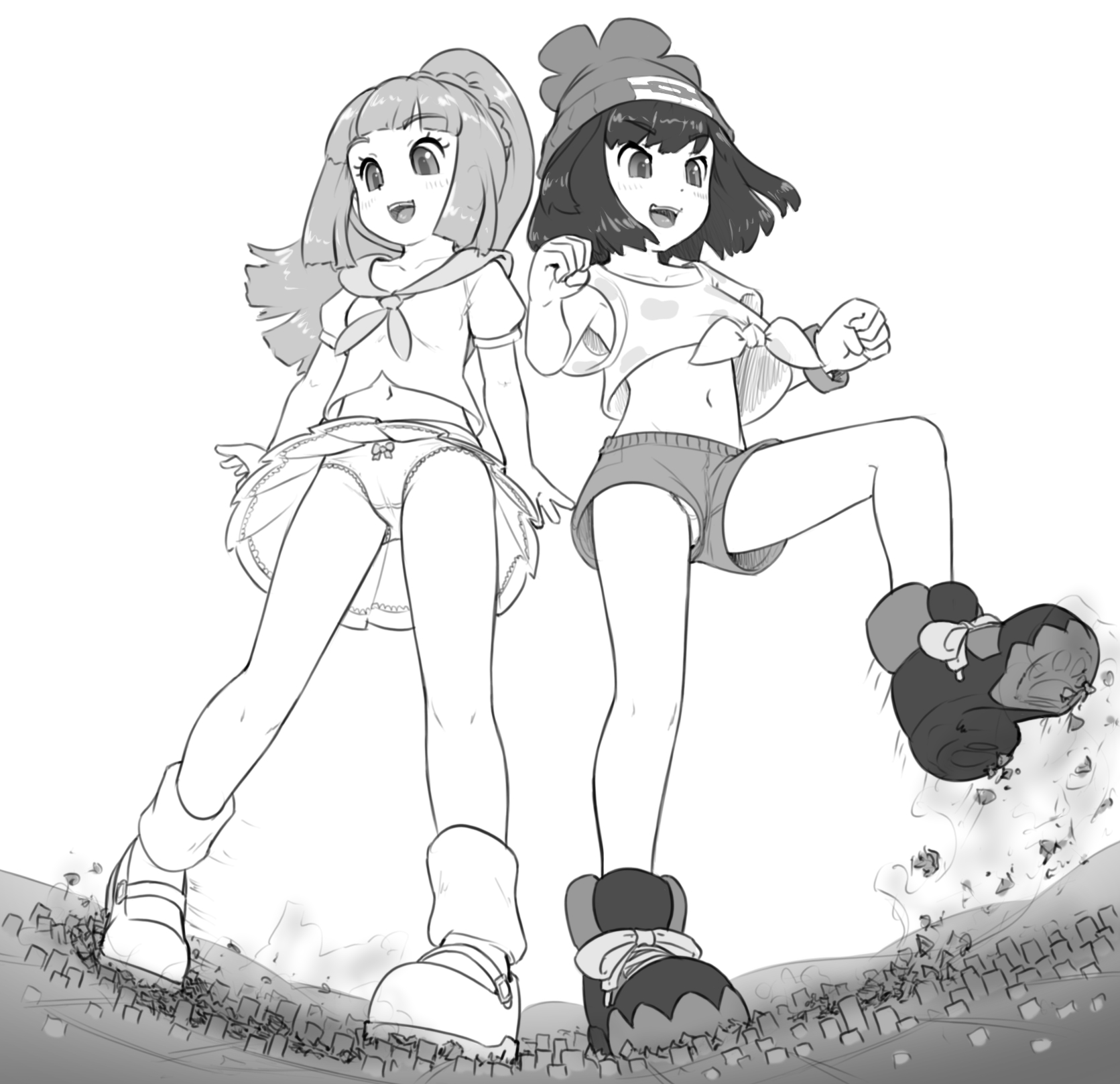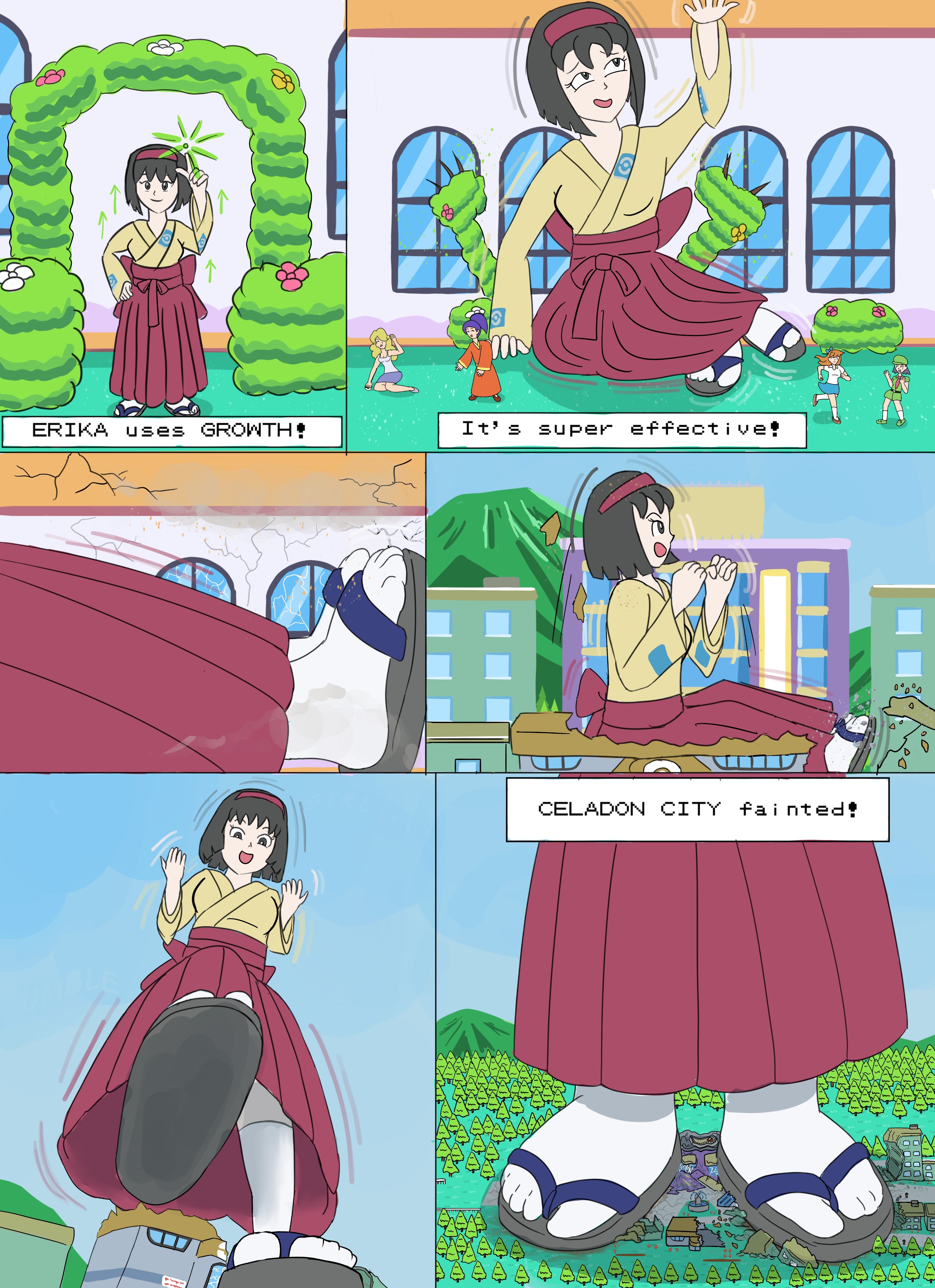 >>59094085>Eri came back to her room tired but satisfied. Team Star’s latest mischief revolved around growing her giant with a stolen dynamax band and having her tear off the Academy roof during an exam to scare everyone inside as her oni painted face stared down at them>now she was able to take off her costume, wash away her makeup and relax>she wasn’t aware that during her prank, multiple students tried to escape the giant by climbing down her legs and when he shrunk down to a less apocalyptic size, those stowaways shrunk with her>a group of flea sized students helped each other find their way out of a pile of Eri’s discard cloth and onto the endless stretch of floor in her apartment>miles away a shower could be heard. Some wanted to go in that direction, knowing getting found was their only hope for long term survival, but someone pointed out, that if Eri finds them sneaking into her bathroom while she’s in there naked, that no doubt impressive view of her will be their last>so they waited outside, until the huge door swung open revealing no less huge Eri, now in her casual attire>tiny students began yelling and waving to get her attention, but they were too small to be heard>before any of them could react, Eri’ bare foot fell on them smashing them into the ground>when her still moist foot lifted all the shrunken students found themselves stuck to its bottom>and so it continued, Eri’s foot slammed down on the students, before lifting them back up and slamming down again, until no trace of them remained