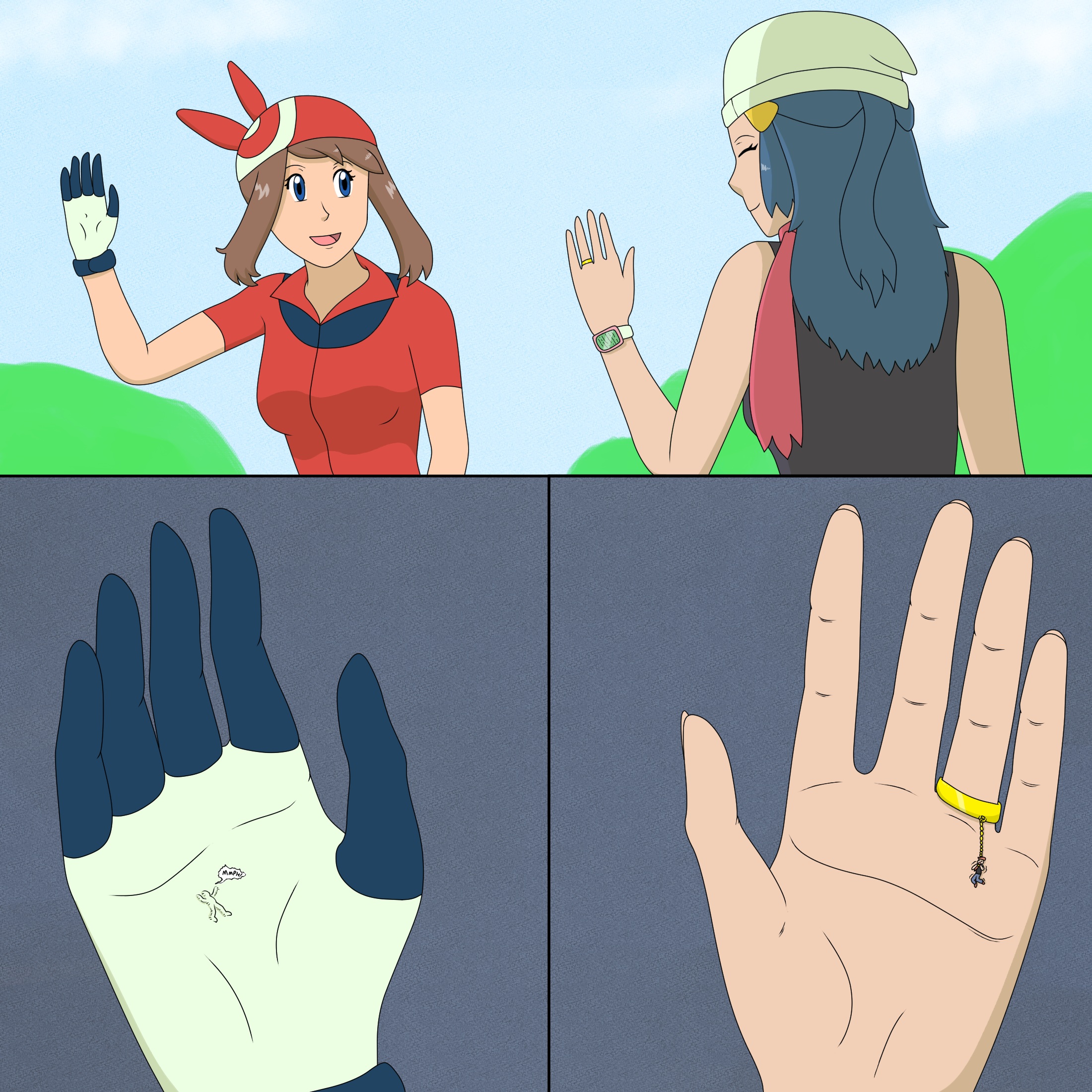 >>59097109Maybe a simple story based off of pic related? Just May and Dawn having a brief nonchalant talk as their shrunken rivals are suffering in their predicaments after having lost earlier