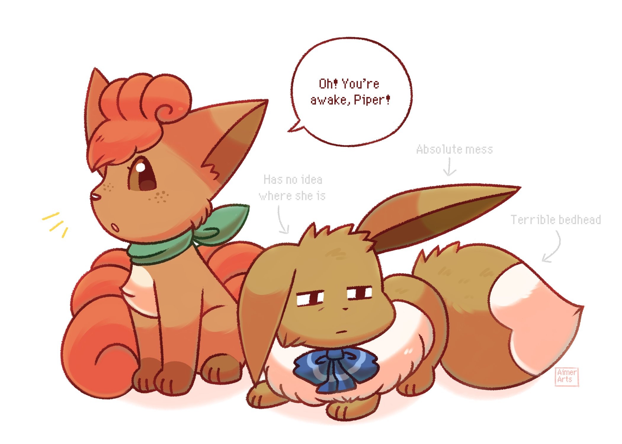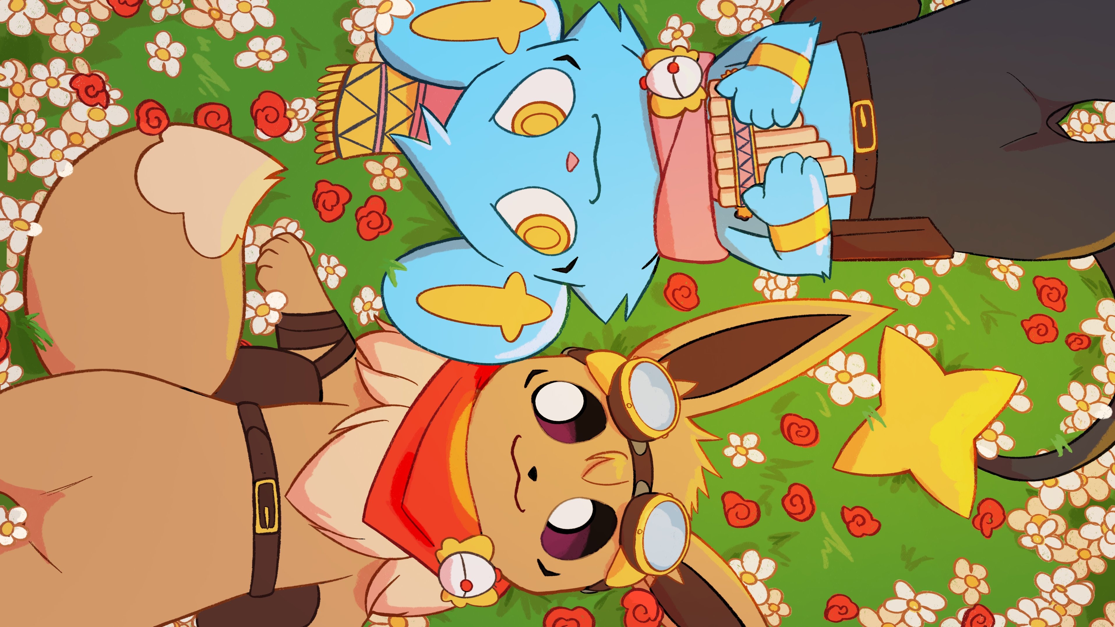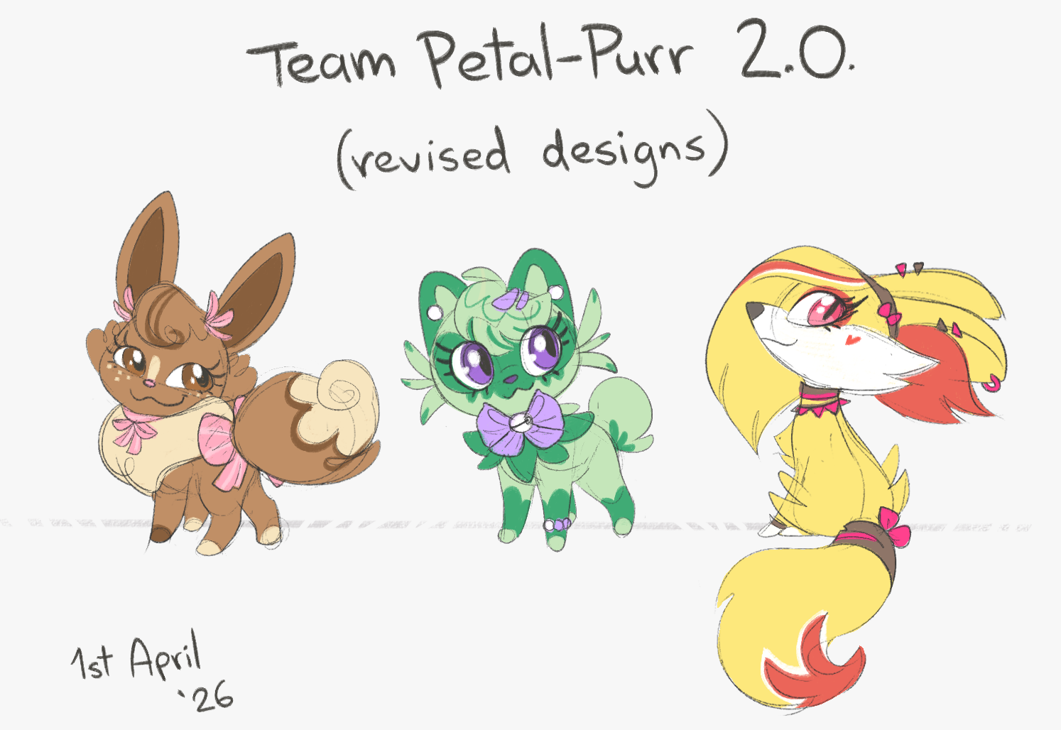 After extensive research, the shareholders have determined that the "Team Petal-Purr" needs an image shake up in order to survive in today's fast paced economy. Species and appearances have been shifted to accommodate the fresh new tastes of today.The following changes have been approved:>Shelby>Skitty is no longer the most marketable of the catmons and is in danger of growing stale. The Eevee is a more versatile pick that is sure to stay current for years to come.>Blossom>Though Bulbasaur's popularity remains consistent, it cannot match up against the broad appeal of a green cat. Sprigatito is the usurper of two thrones; grass starters and catmons alike.>Heidi>Houndour has extremely little cultural relevance and is no longer a species that gels with the image of our brand. Though Vulpix was considered, it was decided that Fennekin resonates more with our target audience.We expect a substantial rise in market value. Thank you for your attention to this notice.