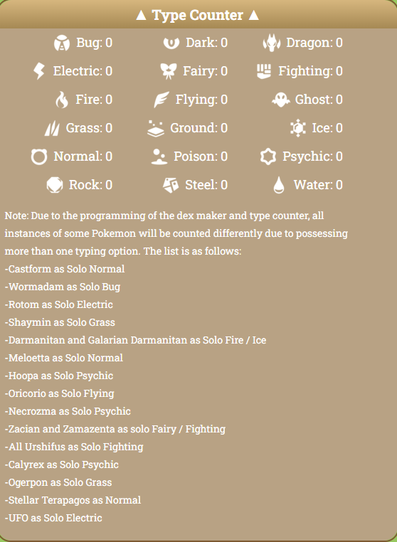>>59099678>>59100398Ok got my tism juiceWish there was a type count in the dex bc I feel like I might have neglected at least one typeAlso probably too many electrics