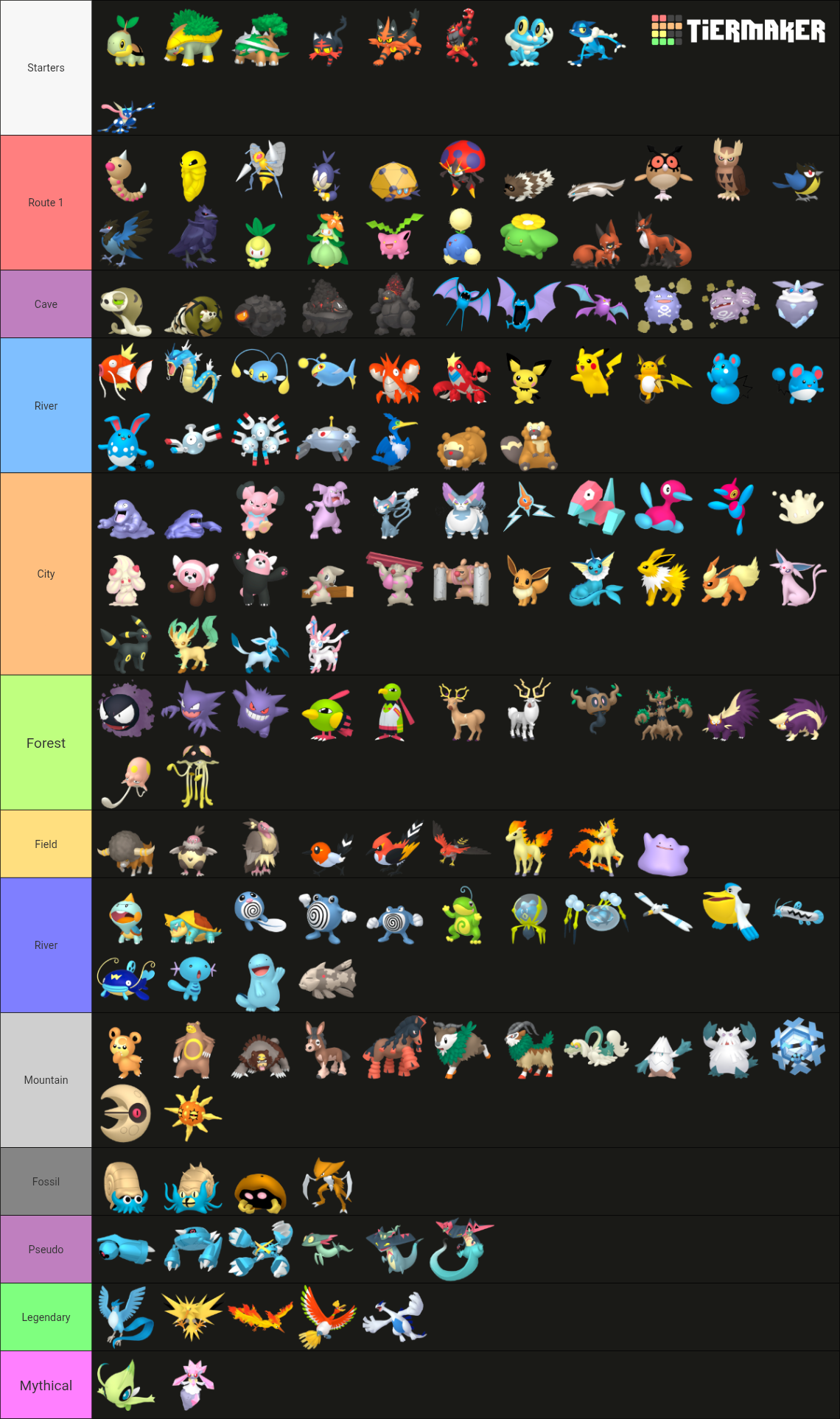 >>59097732Was harder than I expected. Was thinking of a new region that starts out with you in a village in a more temperate forest area with a river, then going tundra > snowy boreal forest > cave (with a hidden underground lake where you can catch some ancient mons like Kabuto and Relicanth) > mountainous area, then I'm unsure how the rest would connect. Kinda just started throwing in filler after a while because some types had only like one mon.
