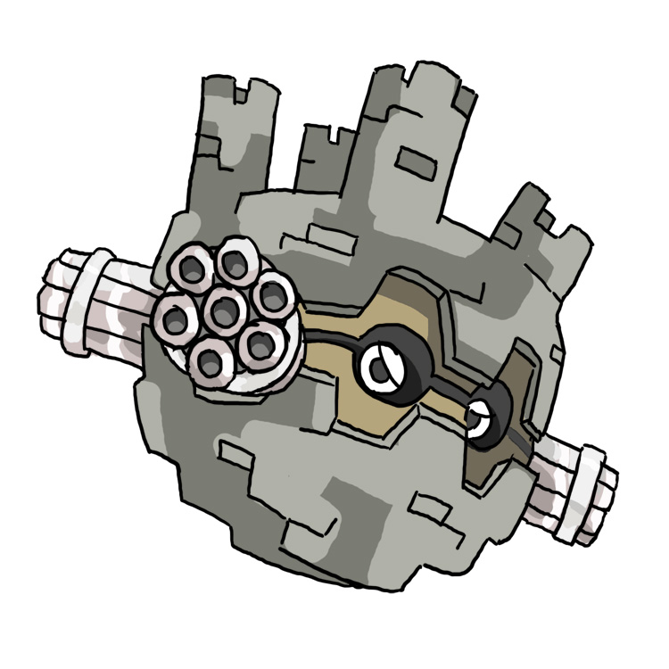 >>59109485one-upping this guy: Forretress evo where the shell is now completely cylindrical, the eyes narrow and turn red, the current red part is now dark grey, and the spikes/turrets around it are now holes that can extend small cylinders out of them. The top and bottom look like the top of a rook/tower. It is taller than it is wide, with the extra height coming from its shell exclusively. It has teeth in a simple blocky smile inbetween its eyes that become visible if it opens its shell slightly.