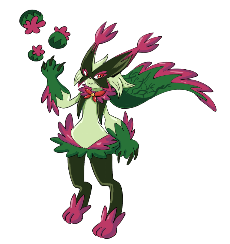 A convergent form of both Paras/Parasect and Morellul/Shiinotic.The Musroms on the Paras line are changed for the other two pokemon. While paras and morellul do work together to obtain food, Parasect and Shiinotic have a more tense relationship, both fighting for control of the "whole".Paras looks the same, but the mushroms on their back are changes by Morelluls. In Parasect case, the big musrom is changes for the Shiinotic musroom head, which is raised slightly so you can see the face of shiiontic peering through.Typing: Fairy/BugAbilities: Effect Spore/Aroma Veil