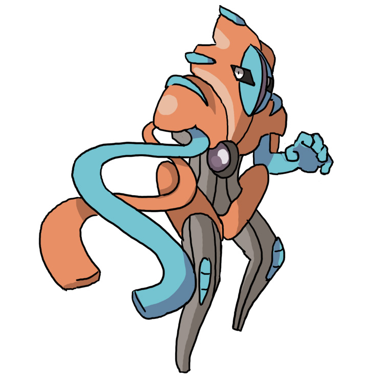 Deoxys-BalanceA balanced form with all stats except health set to 110. Visually, think Samus's earlygame suits with small pauldrons for overall vibe, with gray bits covered up on most of its body but exposed on legs (give it thighhighs lol), and flattened but thin and coiled tendrils for arms, like a mix of Normal and Defense's arms. Head has three spikes like Attack and Speed forms, but they are blunted like on Normal form.