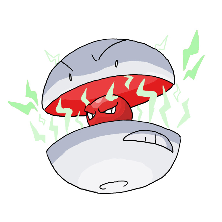Evolution of ElectrodeElectrorbA solid white sphere split in half, the eyes on the top half and the mouth on the bottom half, and between the halves, holding them together, is a solid red core Essentially the demon coreIf it takes 50% or more damage in 1 single contact hit, or if it's K.O.'d by a contact move, it automatically performs a new move called Radioblast, an Electric Type variation of Explosion that toxic poisons all pokemon on the field