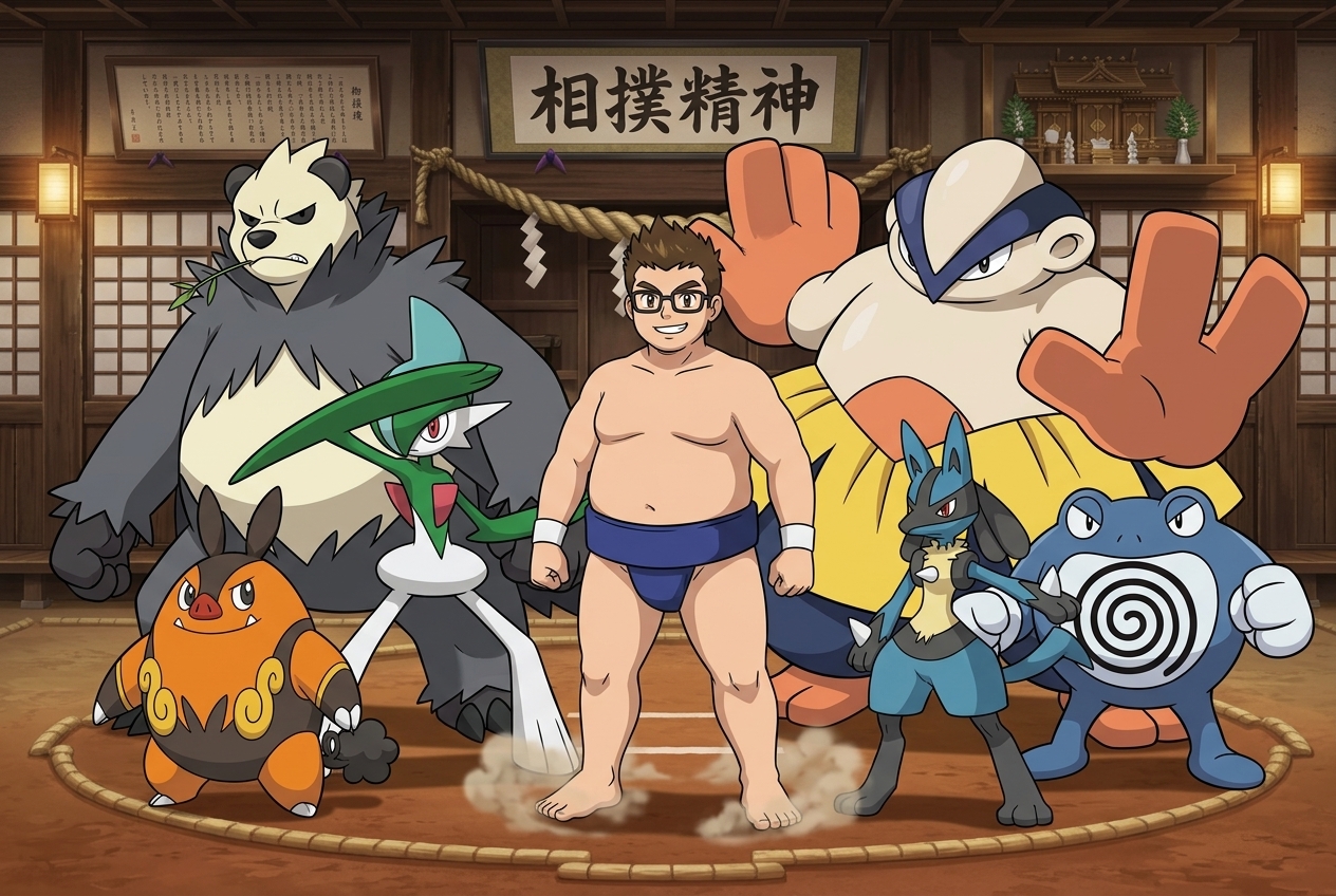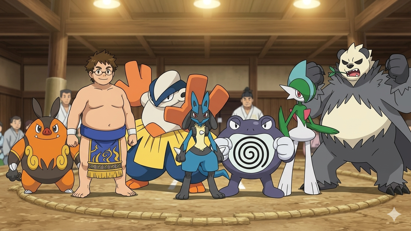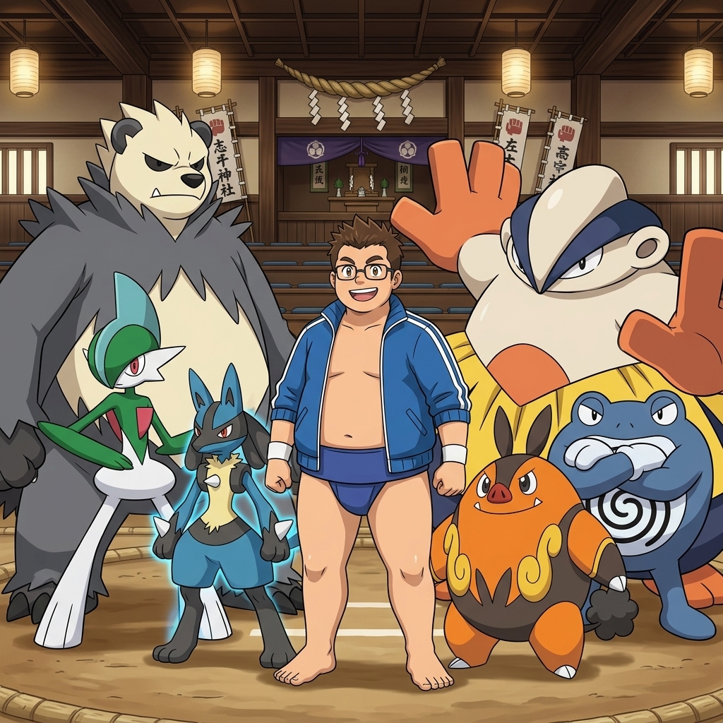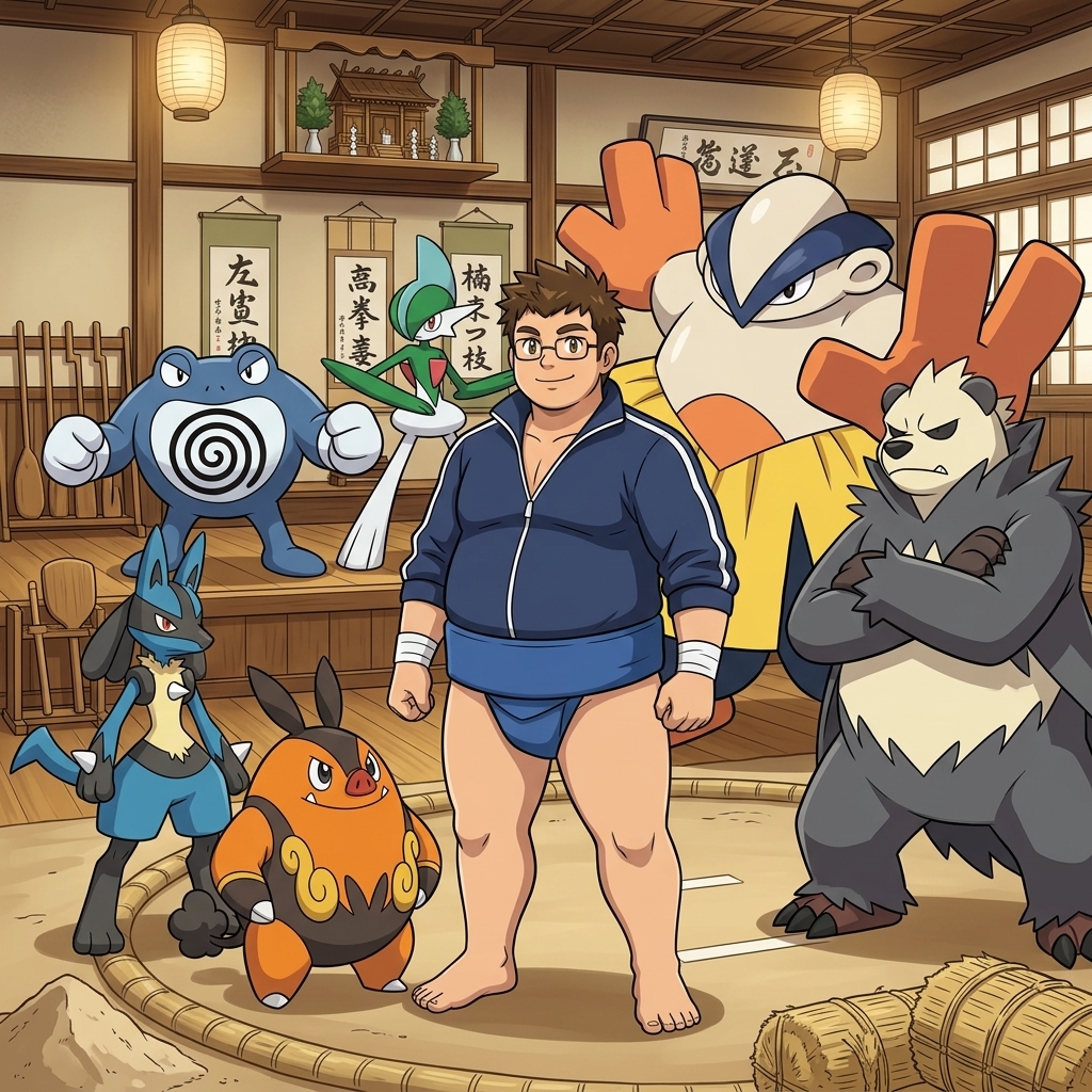 Here a Pokémon Trainer OC of mine I made on Nano Banana. His name is J.P. Flintheart. He in his 20's, and he's part trainer, part wannabe mixed martial artist, part apprentice sumo wrestler originally from the Unova region, but moved to Kanto. His team is mostly fighting type and consists of Pignite (his starter, Fire/ Fighting), Hariyama, Lucario (Fighting/ Steel), Poliwrath (Water/ Fighting), Pangoro (Fighting/ Dark), and Gallade (Psychic/ Fighting).