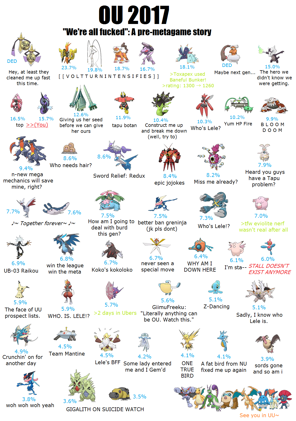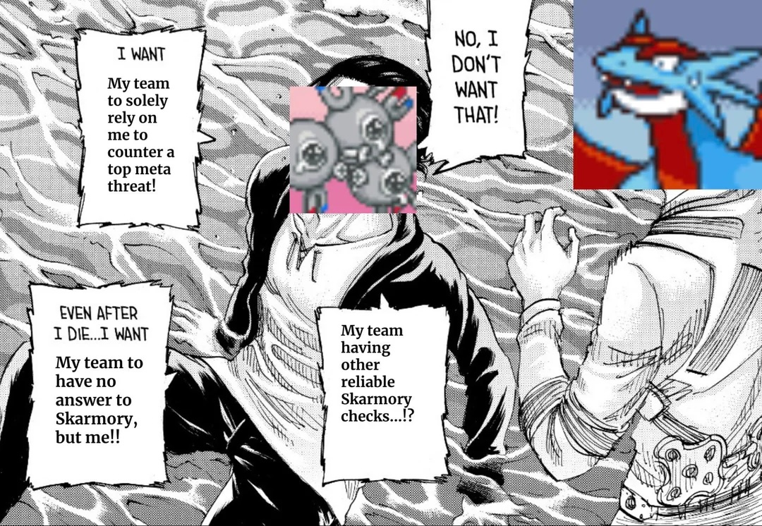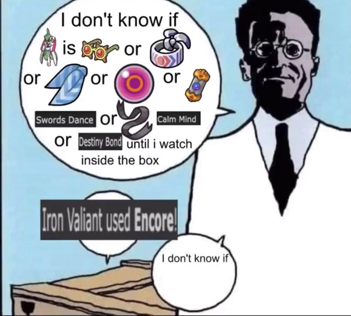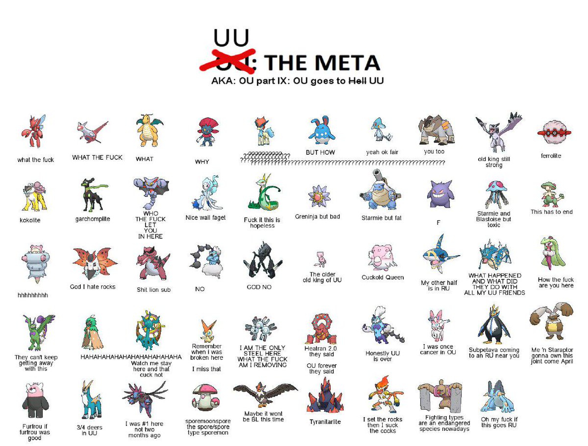 >>59124778We're not saying it has "too many understand"It's just too many references to be a good memewe have>regenerator trio>spikes skarm>evolite chansey>toxic orb gliscor>choice scarf trick gothitelle>the moonlight spammersand many morebut importantly>no jokeThe evolite chansey ready to "eat" a focus blast would have been funny in isolation
