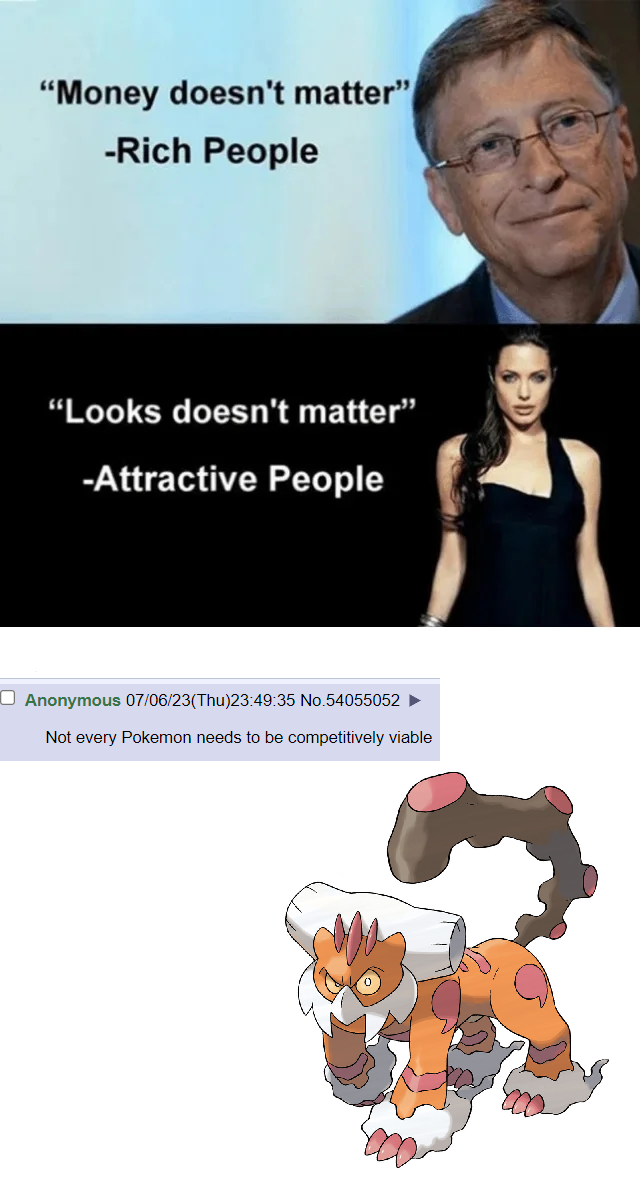 >>59124883To be fair, you have to have a very high IQ to understand Competitive Pokémon. The strategies are extremely complicated, and without a solid grasp of move and ability interactions most of the jokes will go over a typical viewer's head. The fans understand this stuff; they have the intellectual capacity to truly appreciate the depths of these jokes, to realize that they're not just funny- they say something deep about VGC. As a consequence people who dislike Pokémon comp memes truly ARE idiots- of course they wouldn't appreciate, for instance, the humor in Kricketunes catchphrase "DEEELEEELEEEWHOOOP" I'm smirking right now just imagining one of those addlepated simpletons scratching their heads in confusion as wolfey's genius unfolds itself on their television screens. What fools... how I pity them. And yes by the way, I DO have a Pokémon tattoo. And no, you cannot see it. It's for the fan's eyes only- And even they have to demonstrate that they're within 5 ELO points of my own (preferably lower) beforehand.