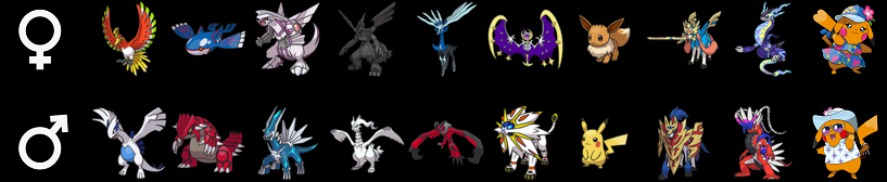 I went with Lugia, Kyogre, Dialga (I think, cant remember), Zekrom, Xerneus (also can't remember), Solgaleo, and I'd pick Eevee, Zacien, Koraidon, and Mr. Windychu. So 5 males, 5 females.
