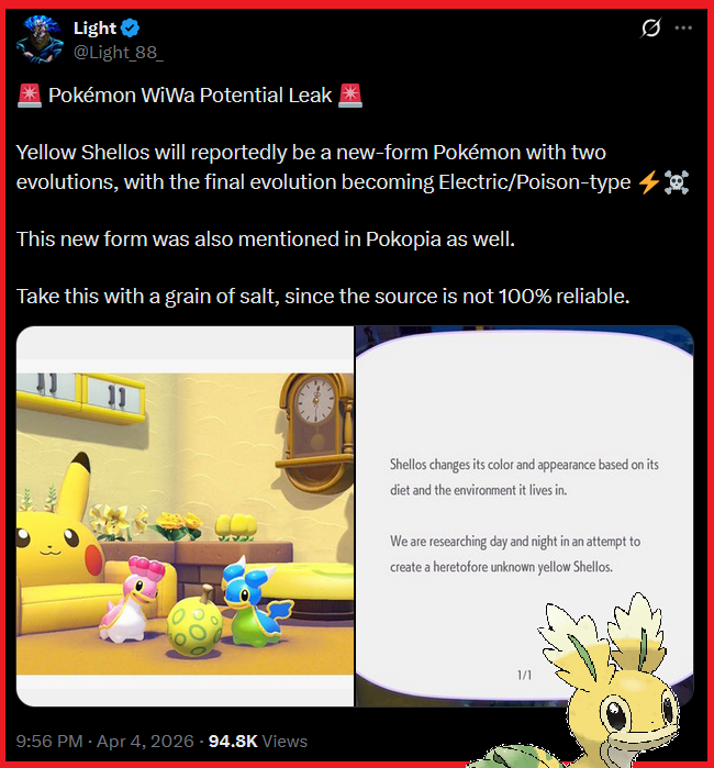 >>59133171Beyond anything it's really funny these "leaks" only happened after pokopia came out.Also I'm gonna be nice and assume all this dipshittery is the result of the overqwil reference in the diamond pearl remakes. Like "oh, they're being meta and telling the audience they're in the process of making a new gastrodon form like it said in the gen 4 pokedex but's never been an actual thing"Like yeah, it is weird to say shellos/gastrodon has a different appearance depending on the sea it lives in and yet japan/america/france/america again/britain and spain all have the same two forms... but that's also true of the arbok line so who cares?