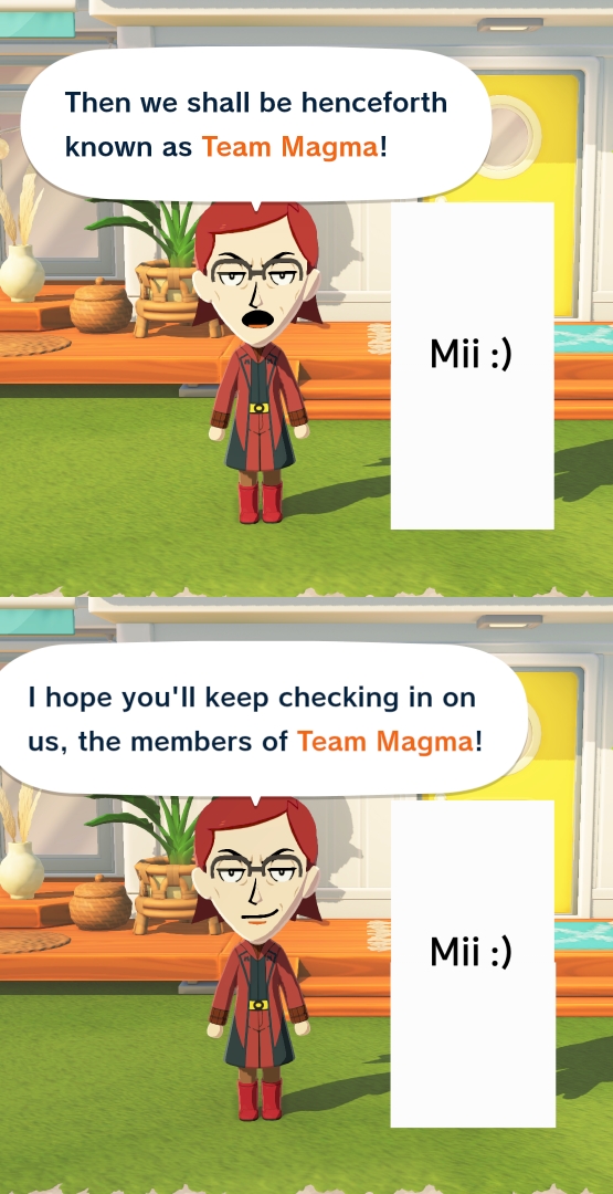 >>59207266My Maxie Mii befriended my Mii and asked her to live with him. (In other words, he recruited her. Guess what their household nickname is.) He also spreads his ideas of "expanding the land" to other islanders. I'm trying to get him into the amazon position; very important.But he keeps falling in love with my Mii and getting rejected because she's already in a relationship. I'm thinking of deleting that other motherfucker, or at least changing his sexuality, because both he and my Mii want to get married and I haven't found a way to make them break up; it's super frustrating. I saw the wedding cutscene because I thought it could be interrupted or something. That didn't happen in fact, to add insult to injury, it was Maxie who sang at the wedding (he looked so handsome and has the voice of an angel though <3) so I reset before the game could autosave.I want to make Mii Maxie happy, goddammit. He's so cute when he fantasizes about my Mii and I love the way he blushes when she's near him.>Ah... Pokémon battling with [anon]… Oh! Did I just say that out loud?He's obsessed with her in the same way I'm obsessed with the real Maxie, kekHe's the first and only Mii to ask if he could give me a special nickname. I was surprised to see "My Beloved" and "Soulmate" among the suggestions. Now he calls me, the player, "My Beloved". It's also interesting that one of the reasons you can give a Mii to not confess their feelings is that you're jealous… I've considered not trying to get my Mii to date him anymore, and instead "romancing" him myself, as the player.On a brighter note, he and a former husbando are good friends. They look adorable when they hang out, since they're kind of similar... Oh, and I also love that I can make my husbando wear all kinds of clothes.>I assume everyone is quiet because they're off playing lolTo be honest, yeah, I got distracted and stopped drawing because of Tomodachi Life.