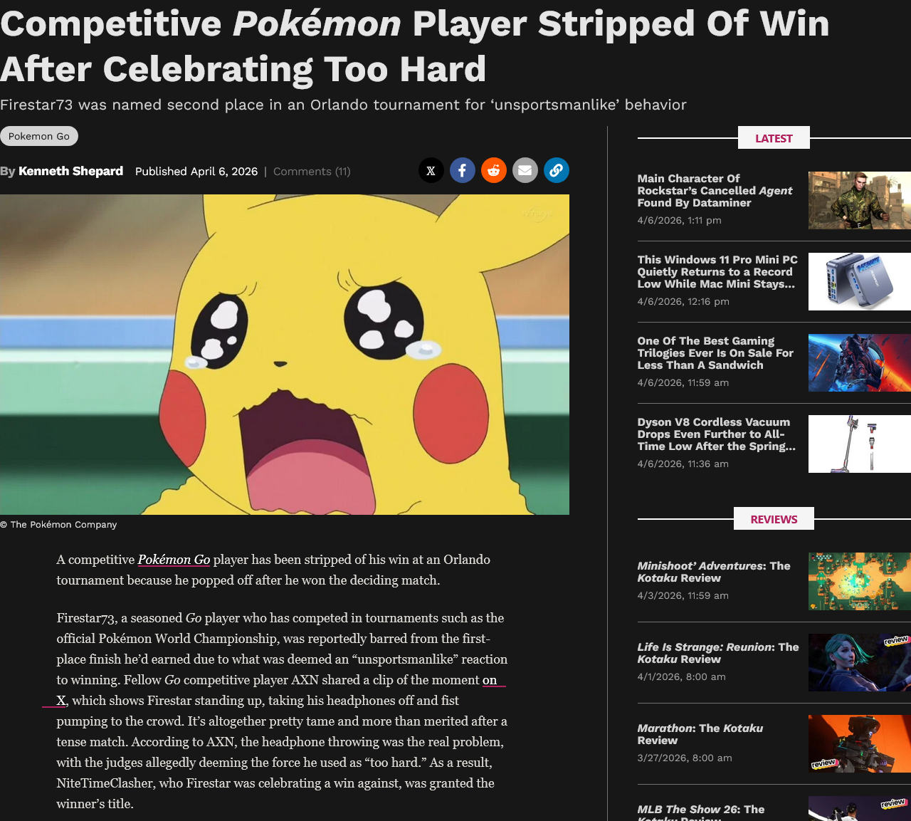 https://x.com/itsaxn/status/2040924406827086032"After a long loser's bracket run, @Firestar73_ wins a decisive game 5 to win the Orlando Regional Championship. Allegedly this celebration was unsportsmanlike, resulting in a game loss and giving NTC The win. I'm at a loss for words, I feel so bad for firestar."https://kotaku.com/pokemon-go-orlando-tournament-firestar-unsportsmanlike-2000685161