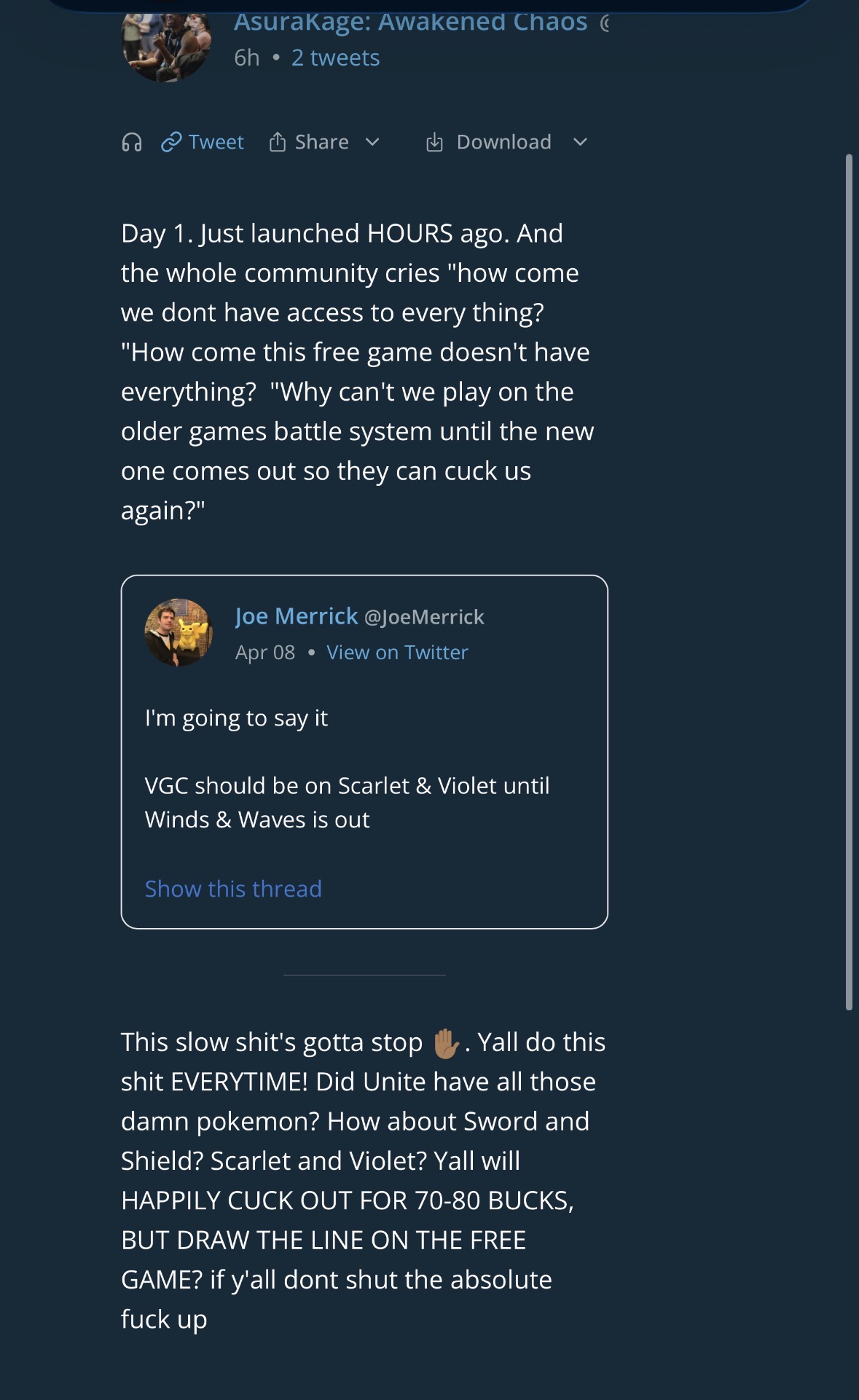 >>59146682They shouldn't market Champions as the VGC centered game if they're taking the drip feed approach to it. I don't mind, personally. It's just a different game with a slowly changing meta every now and then, but people aren't wrong for being upset.