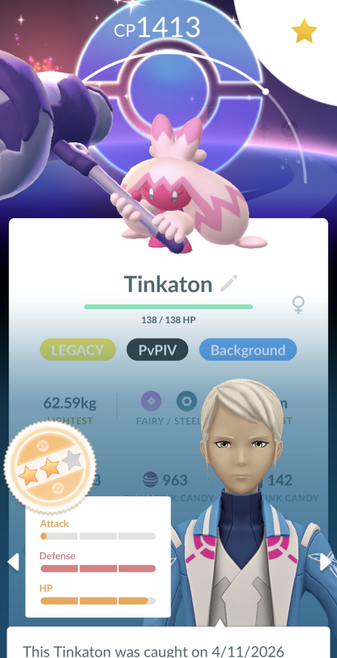 I was a genuis and already had 1 hundo Tinkatuff ready for half a year waiting for this CD.Sadly I only got to play for 45 minutes cuz an IRL obligation took way too long, but I also got a top 100 great league and 3 shinies that I evolved for remote trade fodder.