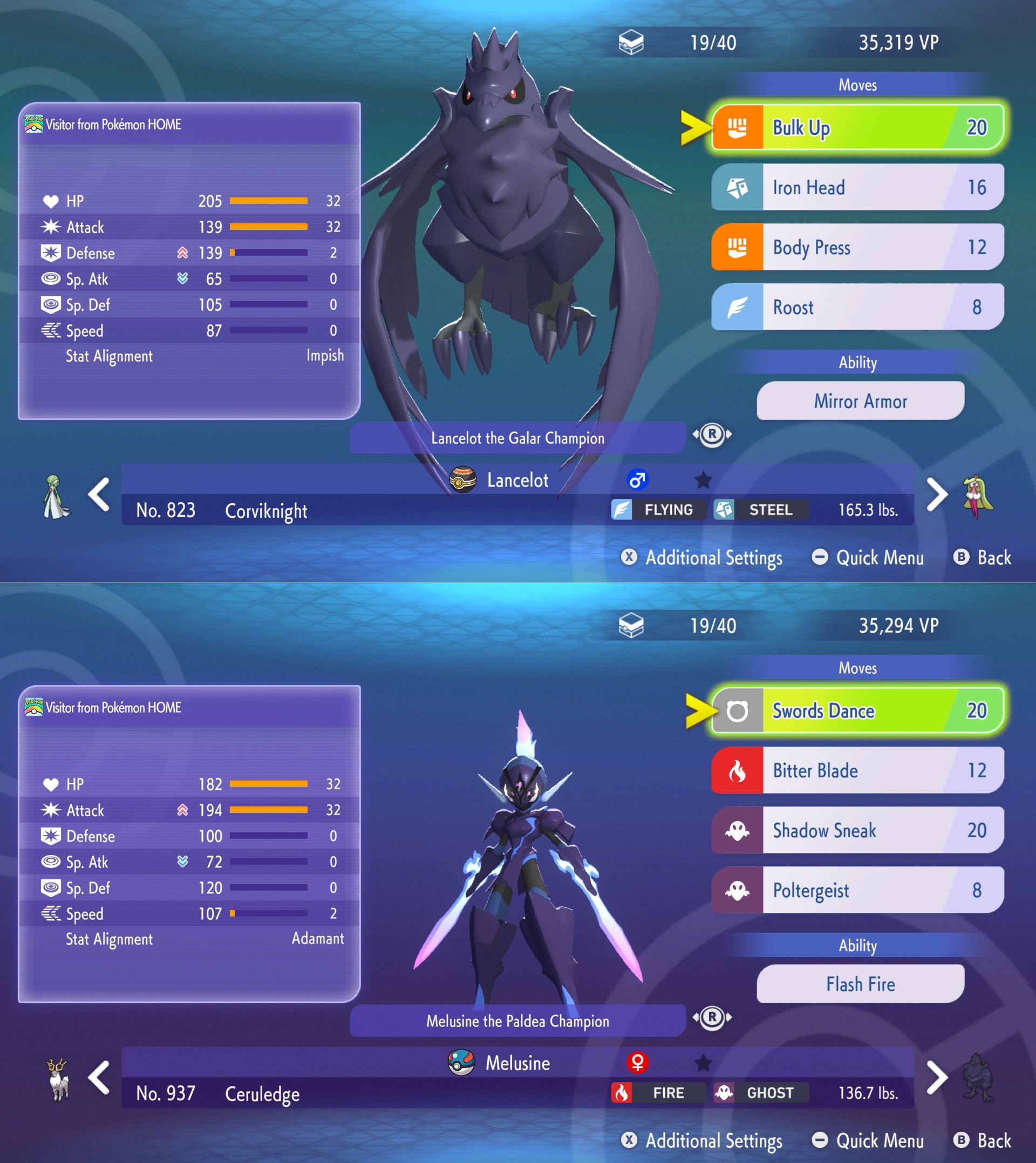 >>59161003In my experience while I climb so far, yeah. I'm not at Master tier yet though, currently at Ultra 4. Charizard is common and they almost always Mega and none of them have been Zard X so far.>>59161020Depends on what the opponent has. I most commonly run them with Gardevoir as a third, rest of my team is Tsareena/Ditto/Toxapex who I'll use if they seem suitable though I don't get a lot of mileage out of Tsareena.I usually lead with Corvi since it only really worries about special Fire and Electric attacks, walls a lot of things like Garchomp etc. so if it looks like their options are limited for Fire/Electric then it's a safe bet, and Mirror Armor reflecting Intimidates is a nice bonus.Gardevoir tends to be a nice third since it can tank Fire/Electric special moves pretty well.I have thought about the fact this trio has two Ghost weaknesses and no real counter to Ghost specifically, though. Tsareena is really struggling to have impact with no Assault Vest, which is making her not fun so I might try out something new. A Dark type might cover that Ghost issue.