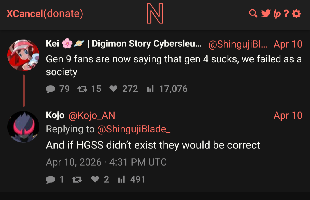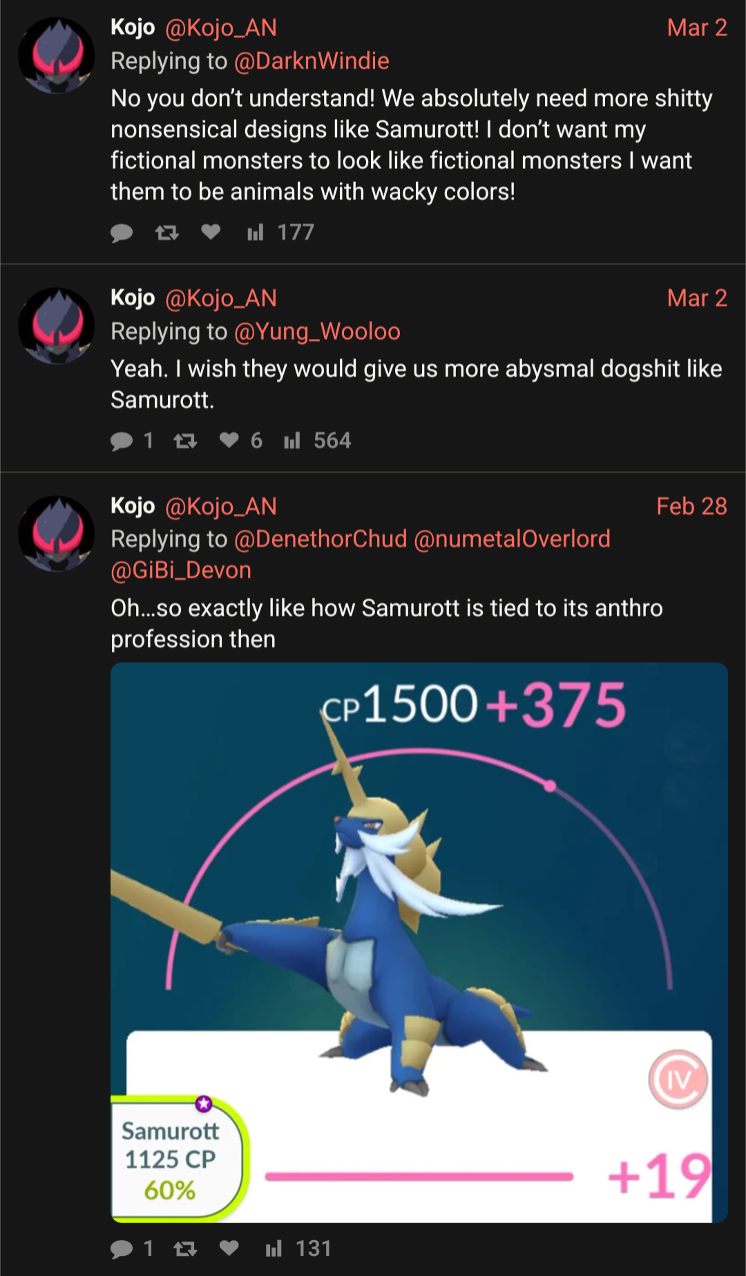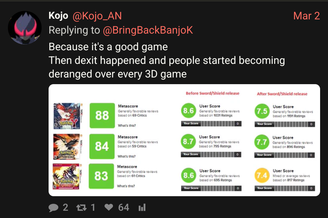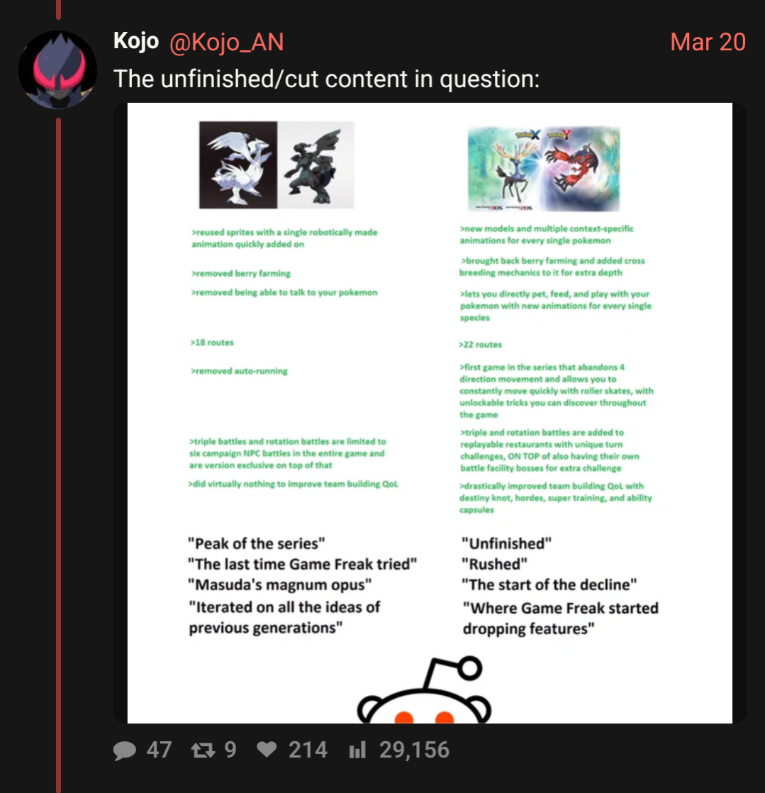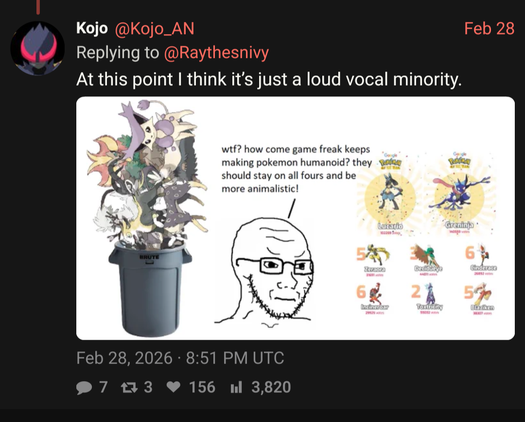>>59162987>Where did the name "Kojo" come from?https://xcancel.com/Kojo_AN/Mirrors the bait that you see posted on here almost 1:1.Unova? Samurott? Cartoon animals? Shitting on Battle Revolution?You want it? It's yours my friend as long as you fall for the bait. He also defends the absolute state that is Champions.
