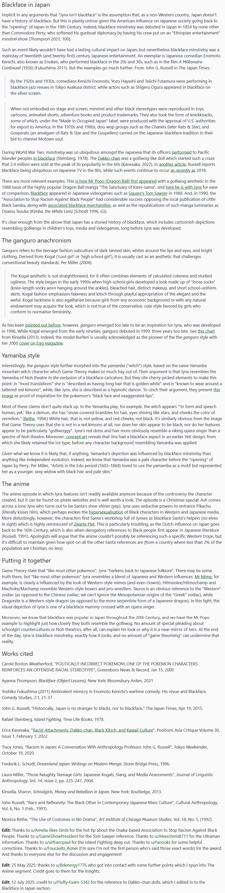 >>59166518There's so much mental gymnastic in this.Like the part where they say Jynx couldn't possibly be based on ganguro because it peaked in popularity later in the 2000s, despite the fact their own source says the style developed in the early 90s.