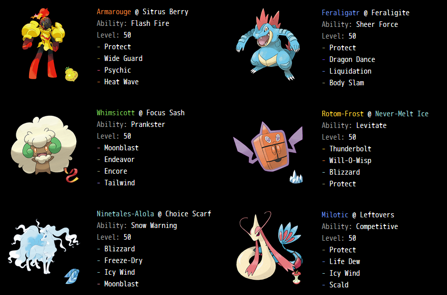 >>59172062>>59172946[continued]For his remaining moves klefki has some options. Metal sound to nab surprise KOs on things Castform shouldn't be able to kill, or reflect/lightscreen to keep the little guy alive one extra turn, or just thunder wave to heavily lower the speed of whatever you want. Let's go with metal sound for now since the goal of the team is sneaky castform KOs and it facilitates that. Give it a mental herb as the item and build it for full physical bulk.Now we can't have Klefki as our only option for weather control so we'll also add Sableye. He has the same prankster ability and rain dance/sunny day. For the last 2 give him fake out so he can flinch a pokemon on the first turn and let castform attack, and encore which can cripple a pokemon by forcing it to repeat a useless move like protect over and over. Sableye is also crucially immune to fake out as he's a ghost type. Build him for special bulk and give him a focus sash.Now you'll notice none of our pranksters get snow, and ice is a very good attacking type, so we'll add in Alolan ninetails(or whatever snow warning pokemon you happen to have). This one we'll give blizzard, Aurora veil, moonblast, and protect. Timid nature, max speed and special attack and give it nevermeltice. It'll be very good at keeping castform alive when he should definitely not be and supplement it's low damage with powerful blizzards.With that we have more than enough weather to play with. What you need now is backups for when castform inevitably goes down. Basculegion is a great attacker who has swift swim, and will double his speed in rain. With prankster you can set rain and have him surprise and outspeed an opponent who was faster before, playing well into the weather shuffle minigame this team is designed for. Go ahead and give it mystic water with adamant max atk max speed. Flip turn, wave crash, last respects, and psychic fangs to deal with sneasler.[too long, one more comment]