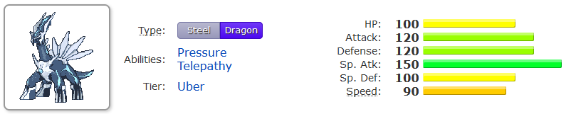 I hope Dialga never gets added to Showdown. Dialga is a terribly unoptimised Pokémon. With base stats of 120 attack and 150 special attack, it seems like it cannot decide whetever it wants to be a physical attacker or special attacker.With the same base stat total, they could have given this Pokémon 260 special attack and 10 attack or 200 speed, 150 special attack and 10 attack to make it a special attack sweeper.What a waste of points.What an unoptimised shitmon with a poor stat spread.I can get if you use it in singleplayer because you find it sexy, which admittedly it is a lot, but in the meta of competetive play dialga has no space with its suboptimal stat spread.