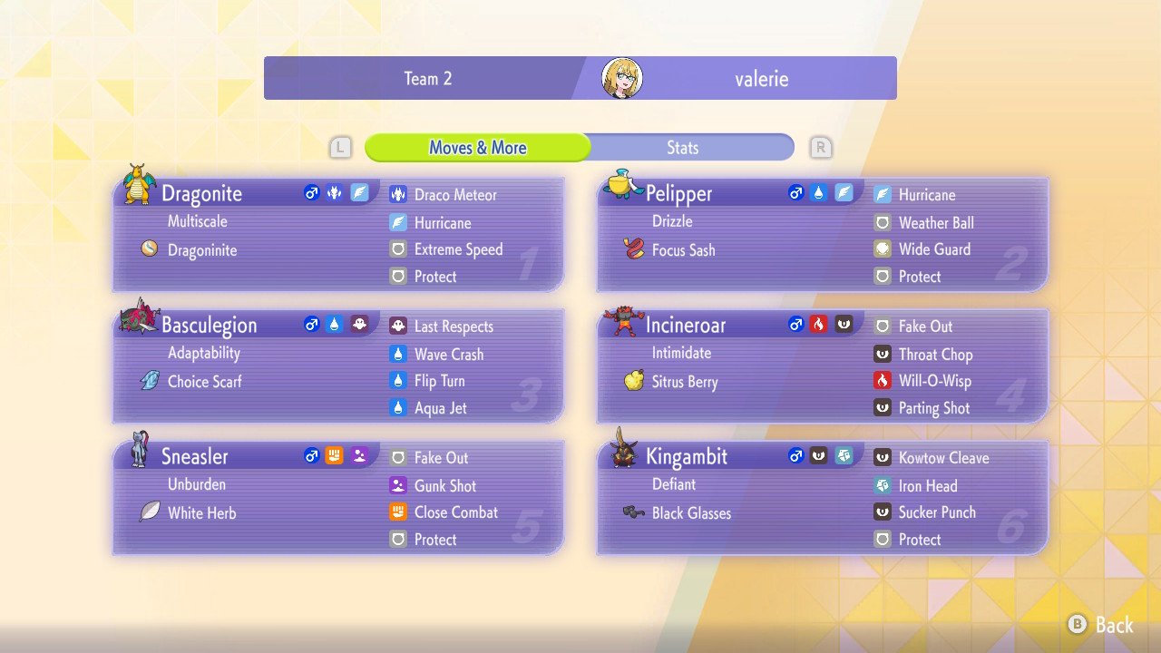 >>59177002You run last respects Basculegion behind it. Whack in a tailwind user to set tailwind and then die with Glalie. Then maybe something incineroar to fakeout on the first turn basculegion comes in and parting shot whatever basculegion isn't 1hko-ing.Probably one of the fastest ways to rank up at least at lower levels due to how little set up there is. Might not have the highest win rate but it will have some of the quickest average game times.