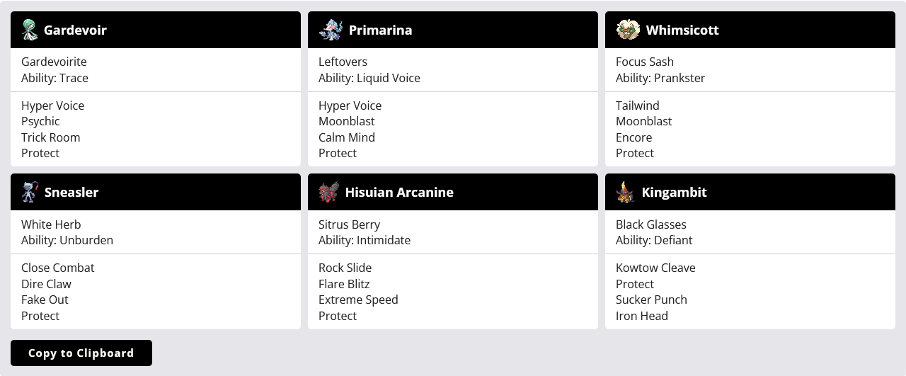 -Lead tank chomp-Mega lopunny + gengar-Metal bird-Scarf meow or basculegion-KingambitEvery single team at 2k+mmr in singles, completely solved dead format